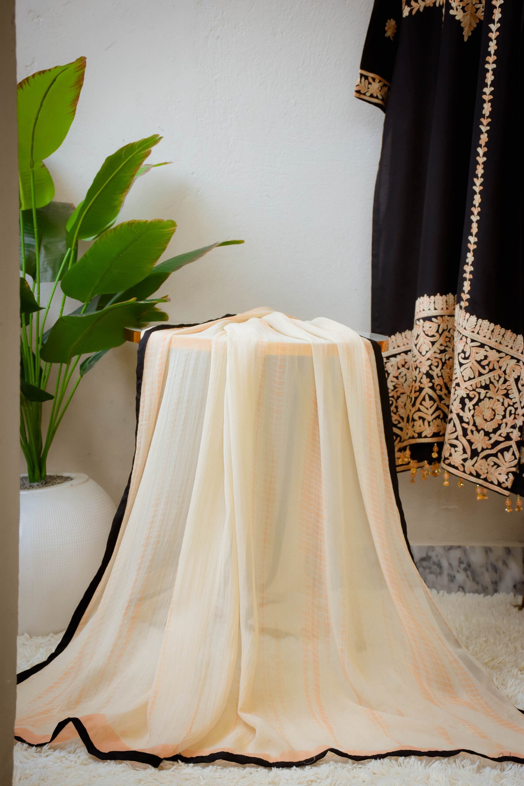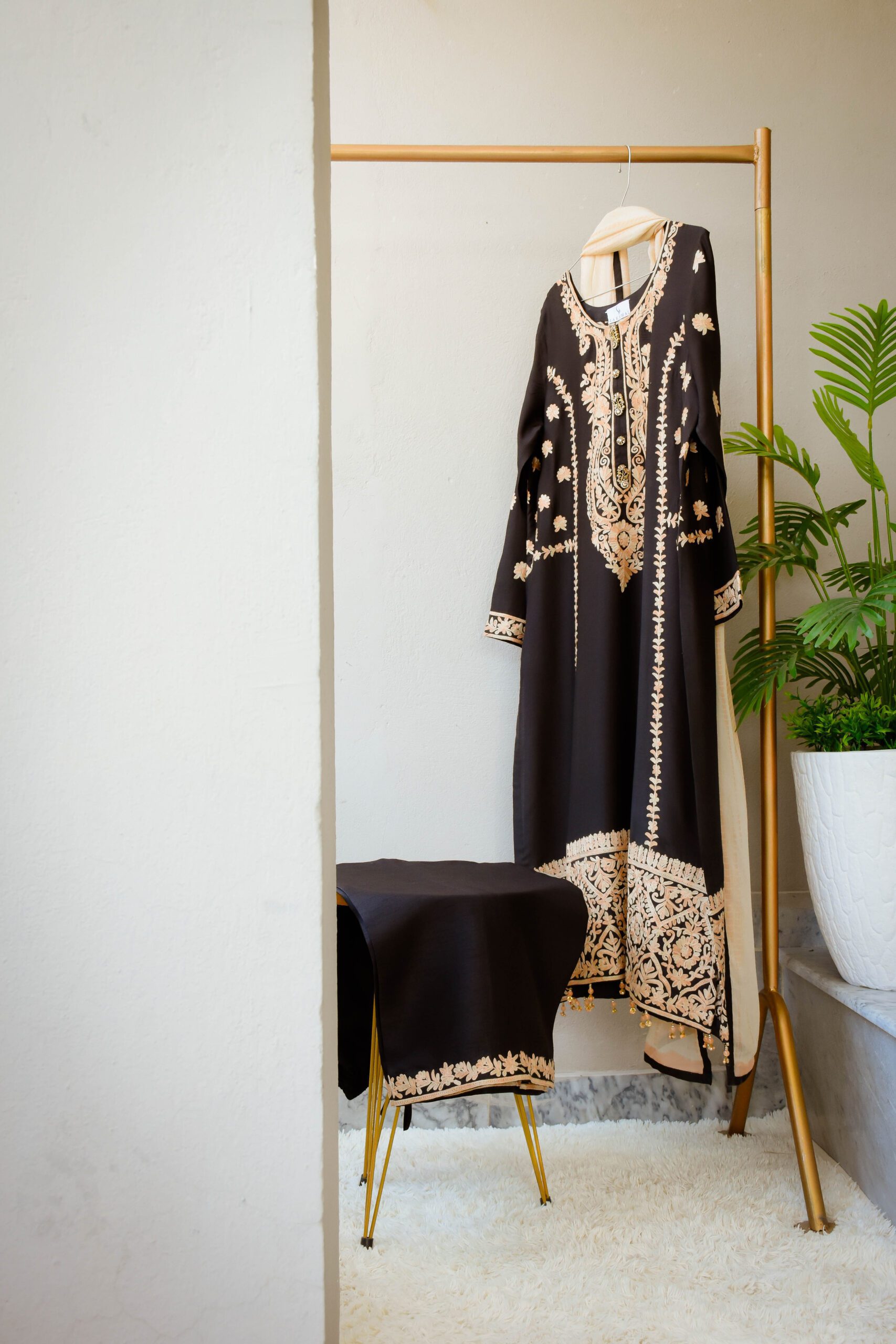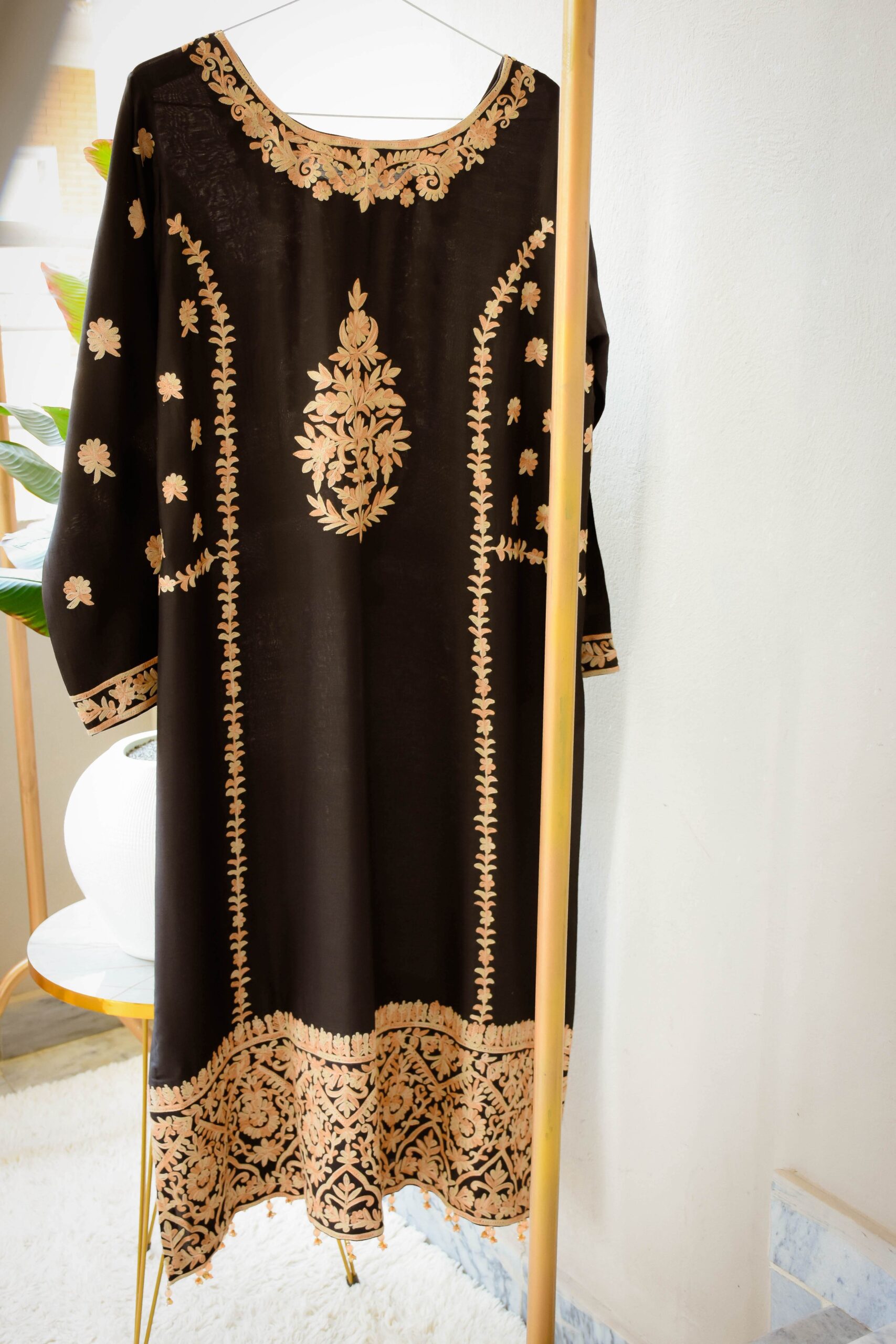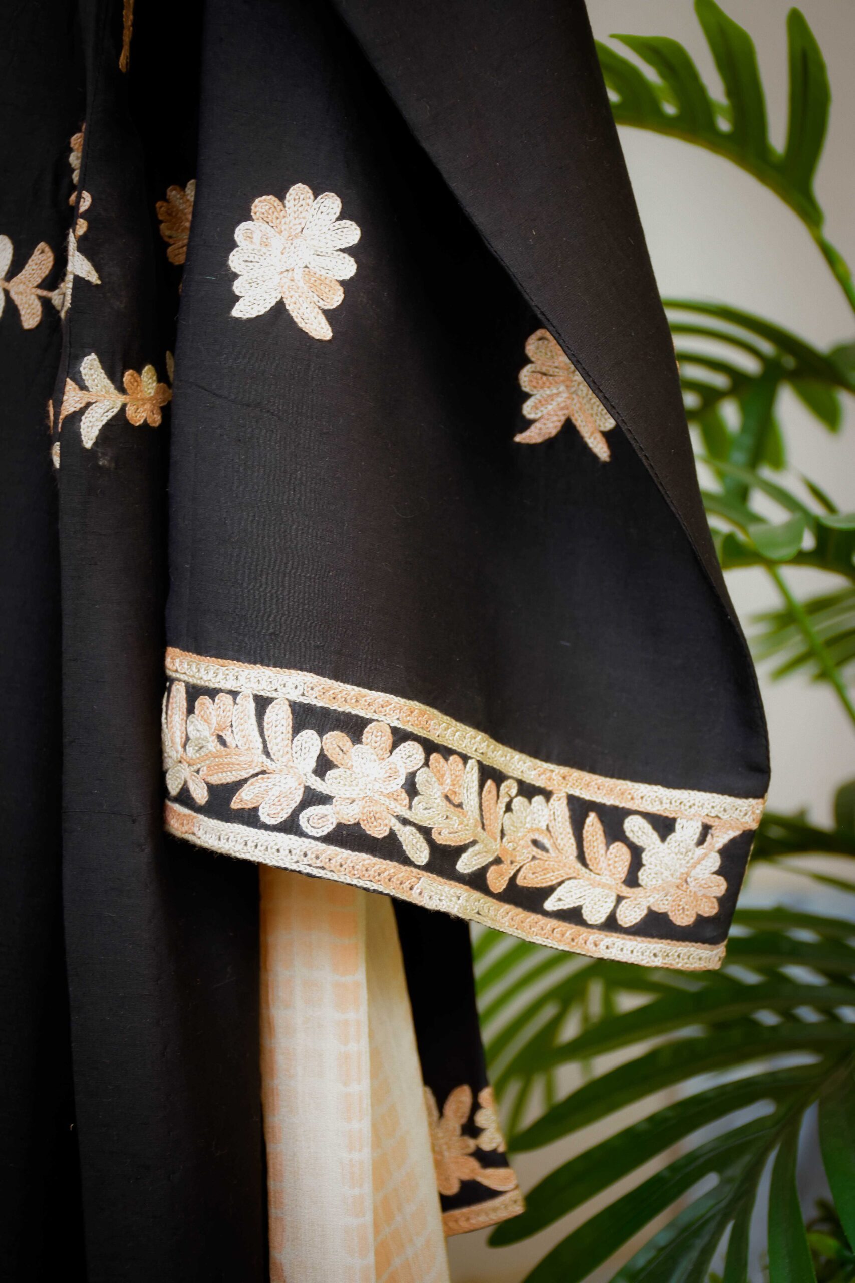 Alvirah (black) from our embroidered collection Kasheeda (vol 2) features a double shade highly intricate and traditional form of embroidery on a hand dyed solid black premium silk fabric. The front and back neckline, sleeves, panels and daman all showcase a delicate pattern created meticulously. Paired with a hand dyed chiffon dupatta with embroidery on all four sides and same colored embroidered culottes. To enhance the overall look, color coordinated handmade tassels have been stitched on the daman.