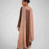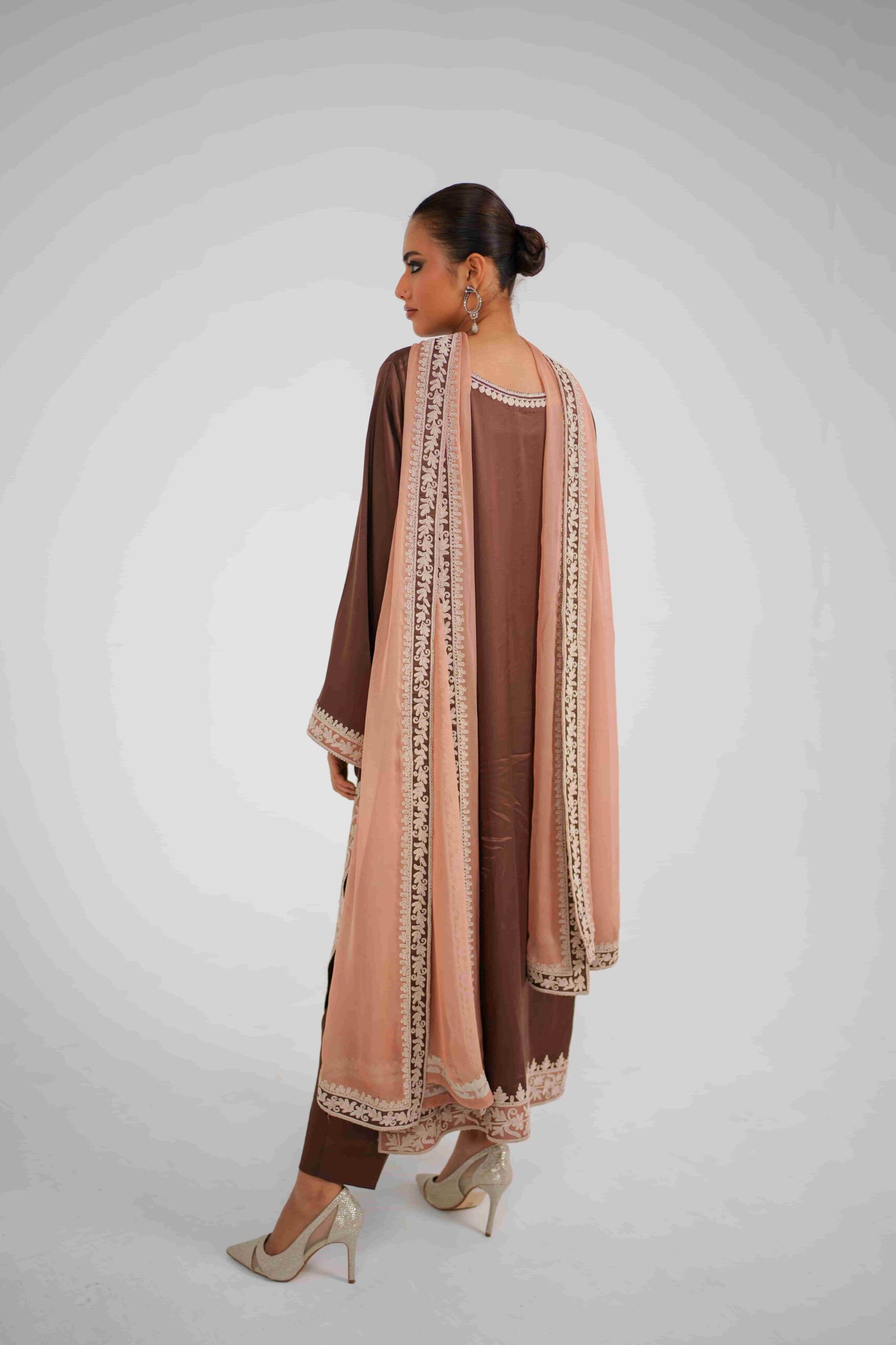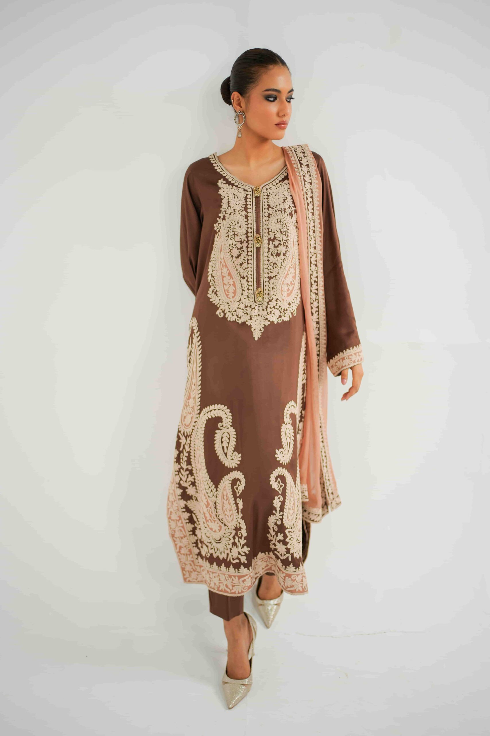 A chocolate brown shamoze silk shirt, delicately adorned with intricate Kashmiri embroidery and coffee-toned accents. Paired with a contrasting embroidered chiffon dupatta and perfectly coordinated straight trousers, it is elegance woven in harmony.