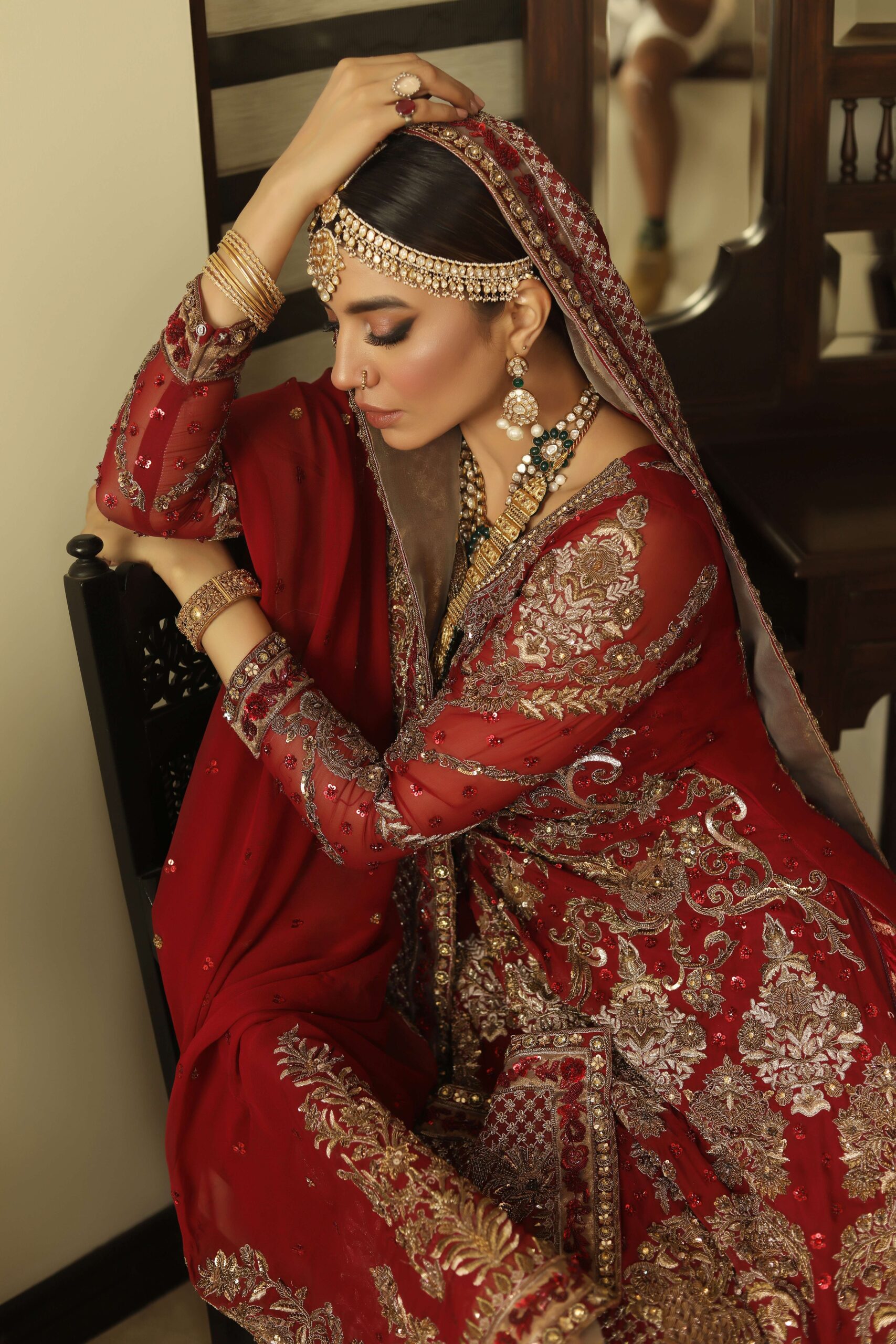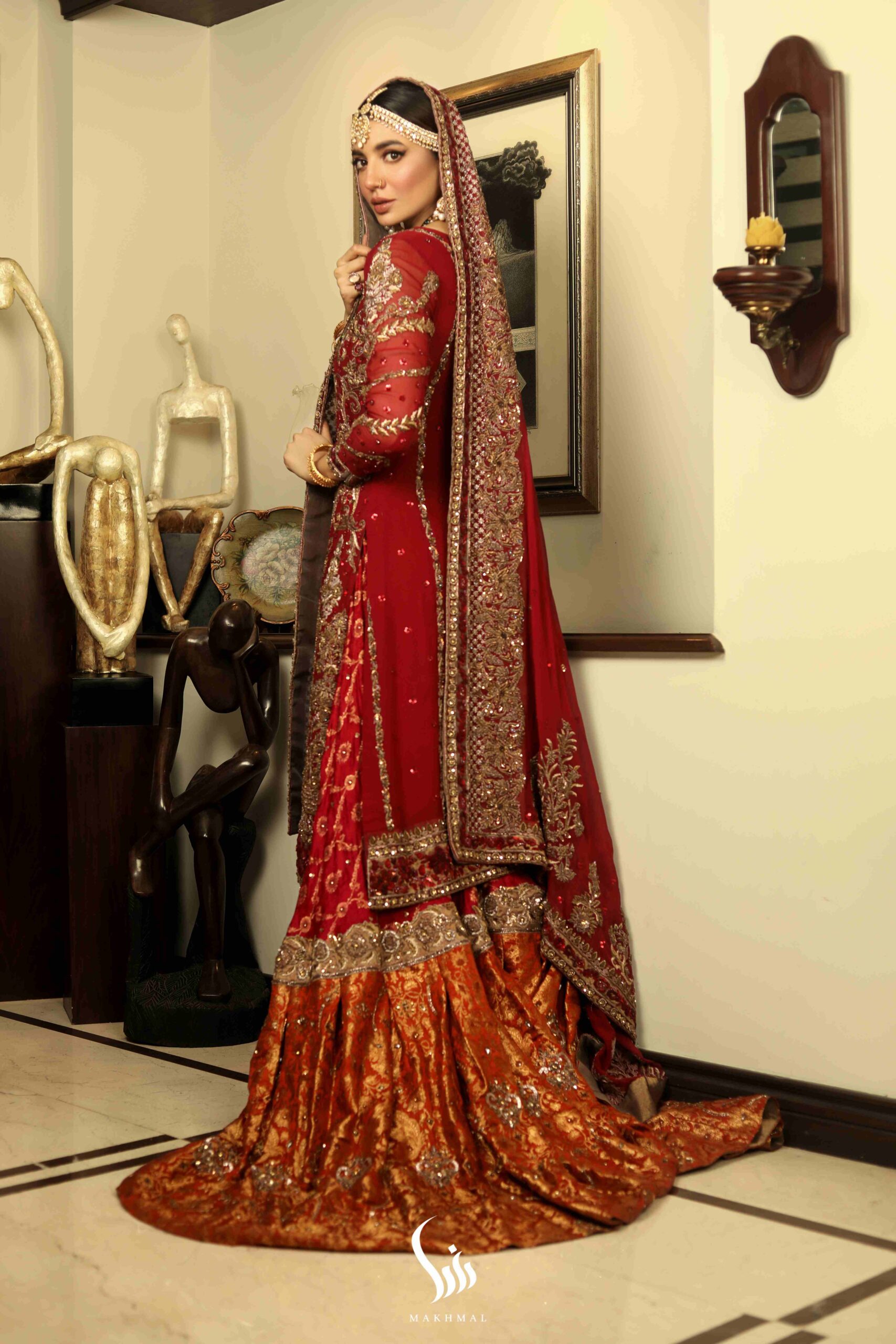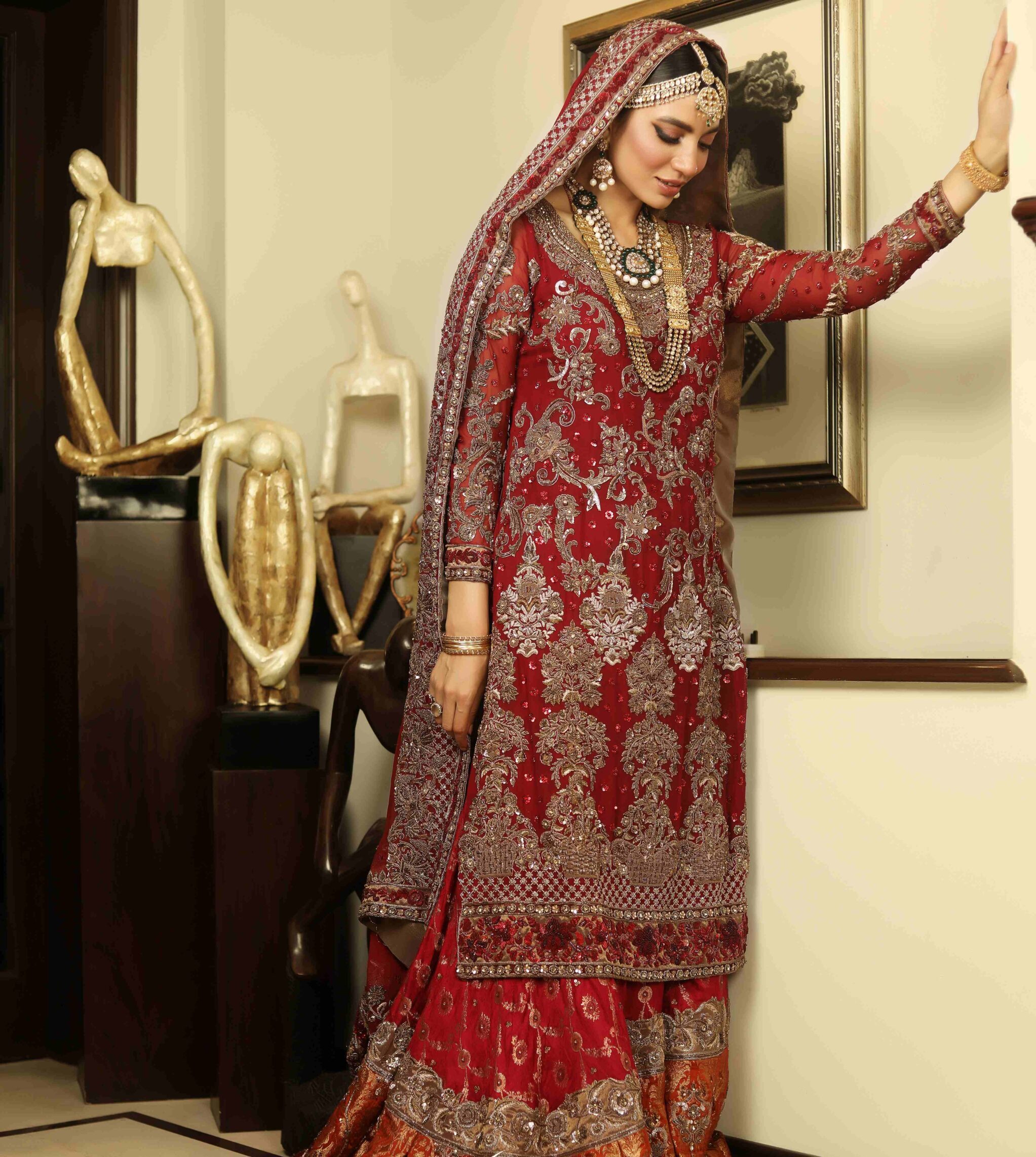 Gauhar is a deep red long chiffon shirt created with antique dabka, naqshi, sequins and sitara using various delicate techniques. Paired with a rust and deep red farshi gharara showcasing a fully hand worked goat-line and motifs. A deep red dupatta with heavy floral motifs and borders completes the overall look of this divine set.