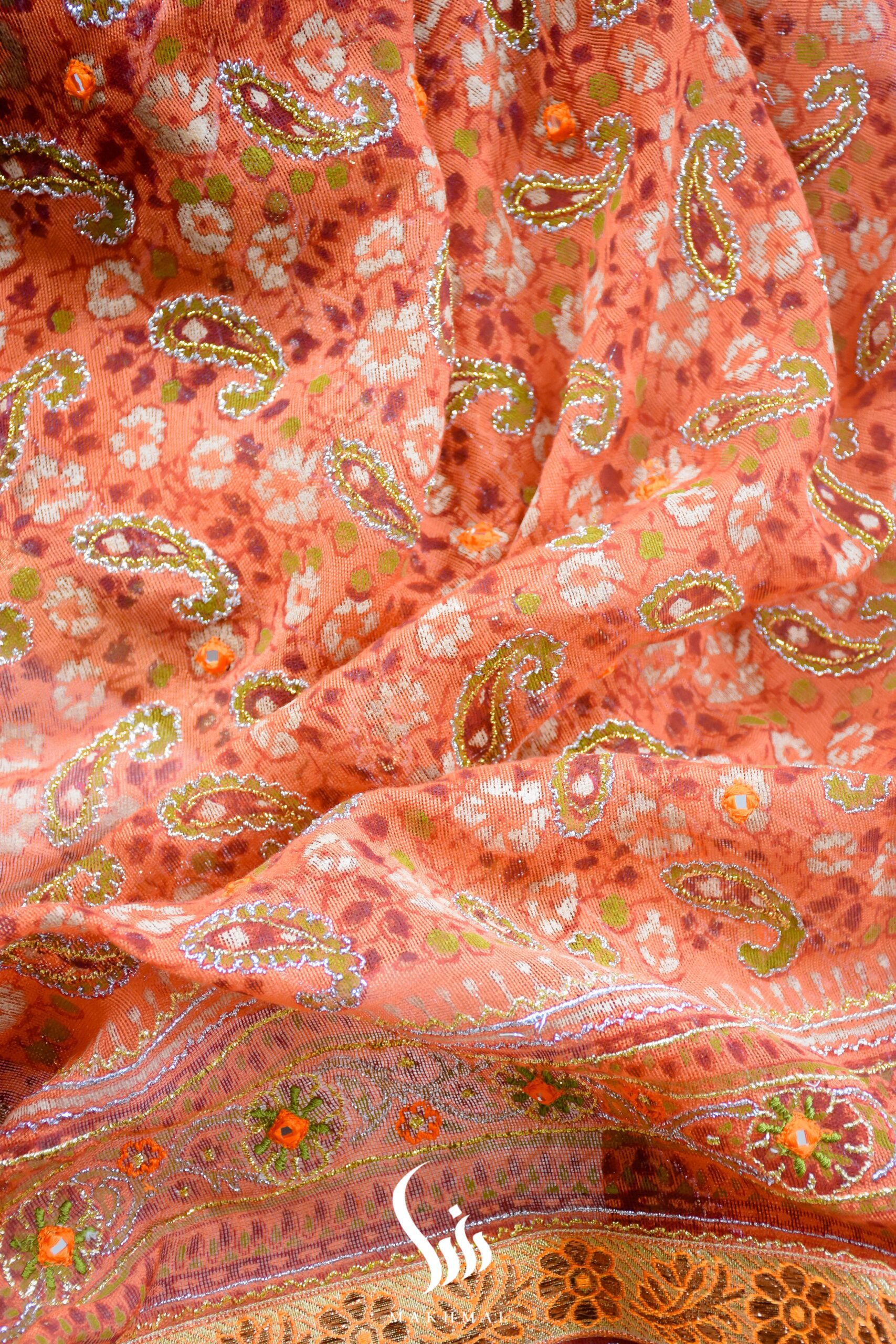 ‘Gul Meena’ features a hand dyed and heavily hand block printed pattern on a silk canvas. To further accentuate the overall look of this gorgeous piece, mirror work has been done with hints of gold and silver embellishments. Paired with a khaadi net dupatta with resham and mirror work all over. Â