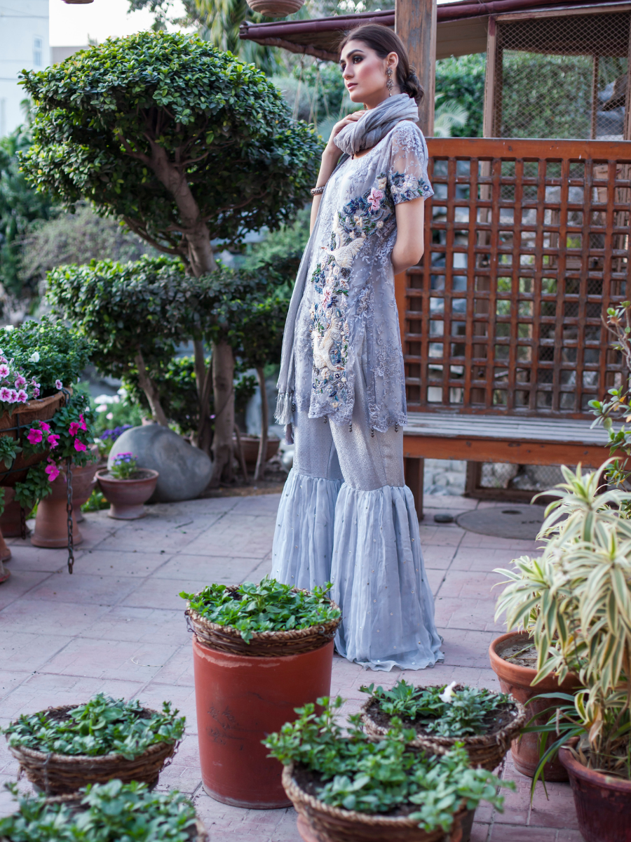 This enchanting creation features a hand dyed light gray lace shirt with intricate thread and bead embroidery depicting a beautiful spring garden. Styled here with a pure crushed tissue dupatta with tassels and a jamawar and chiffon gharara with mukaish work.