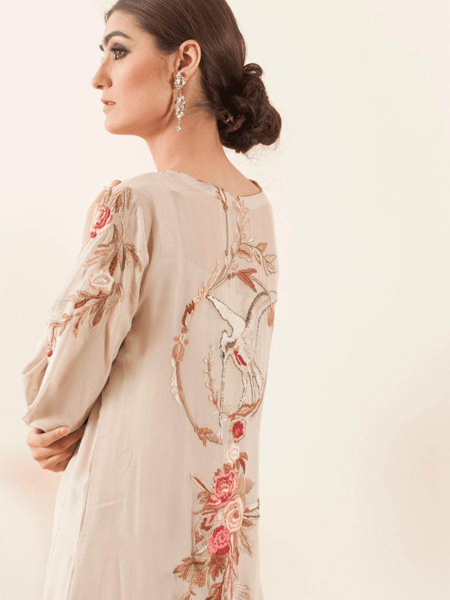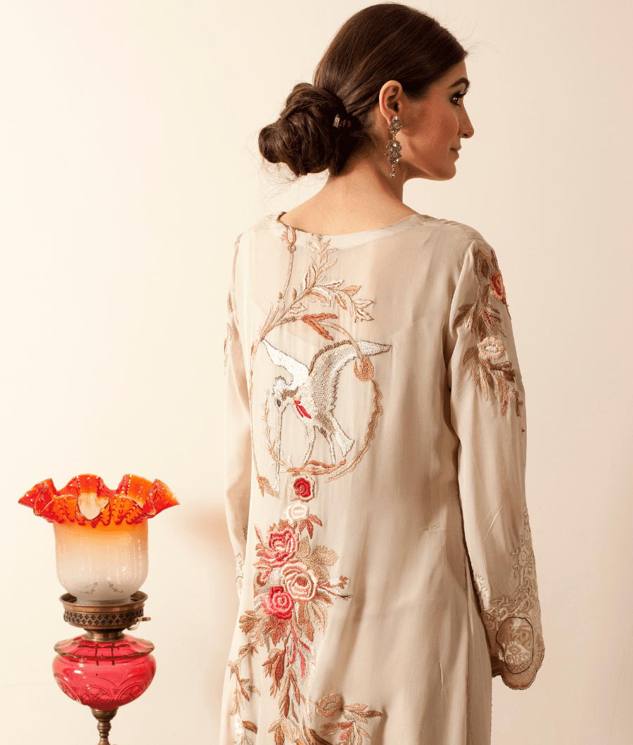 A timeless design inspired by vintage tapestry. Here is an Ankle length chiffon shirt showcasing Victorian roses and birds. Paired with pure silk trousers.