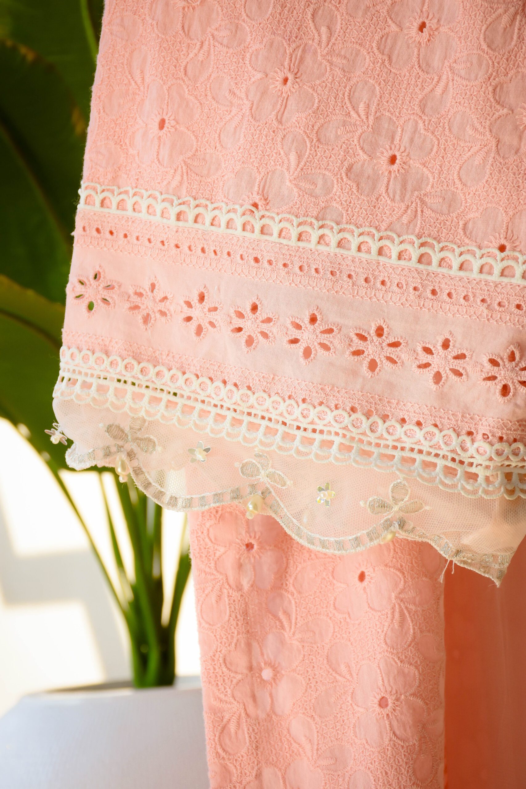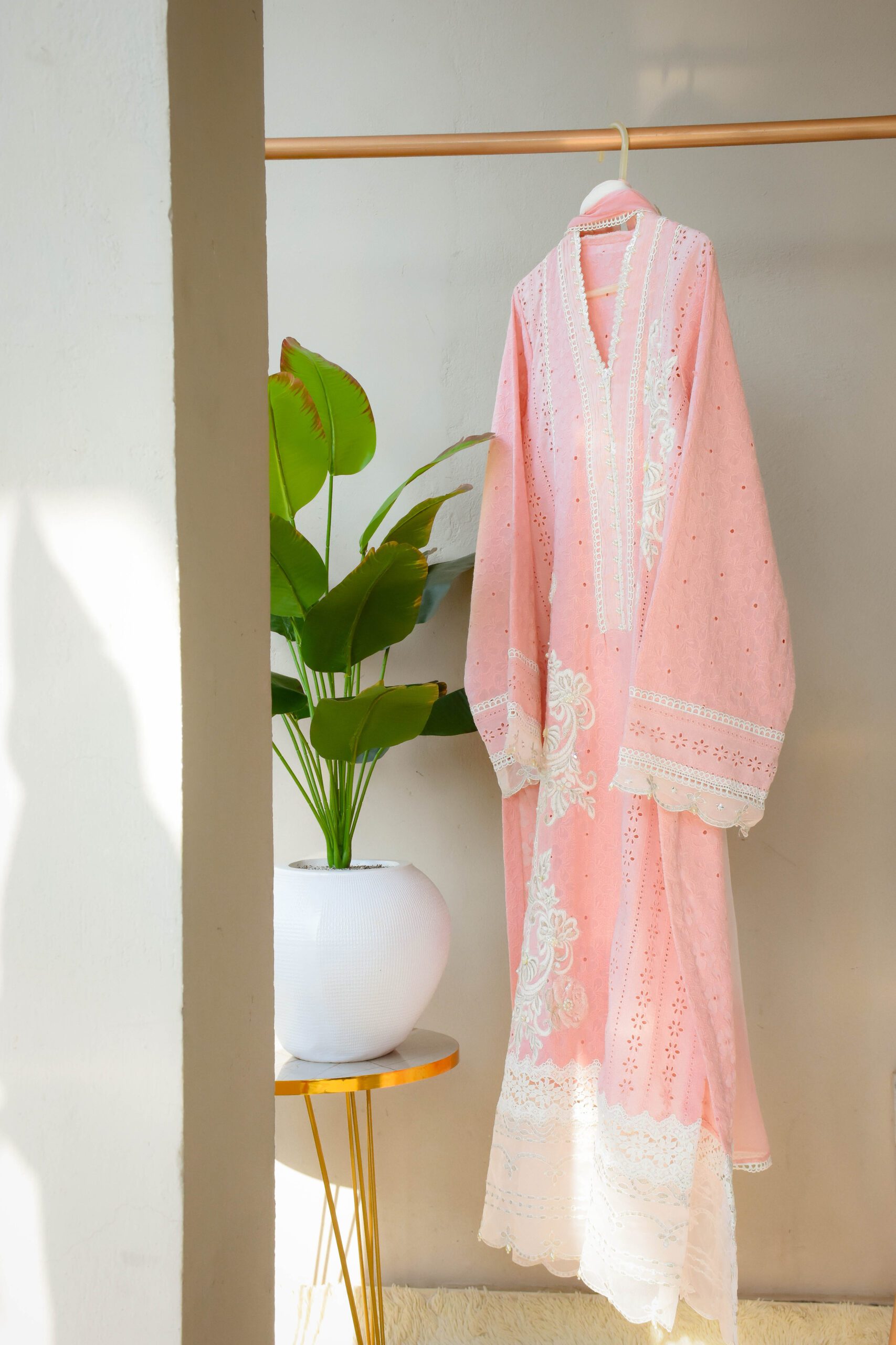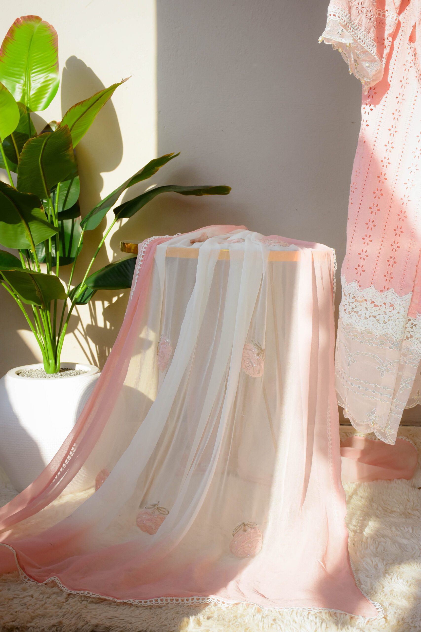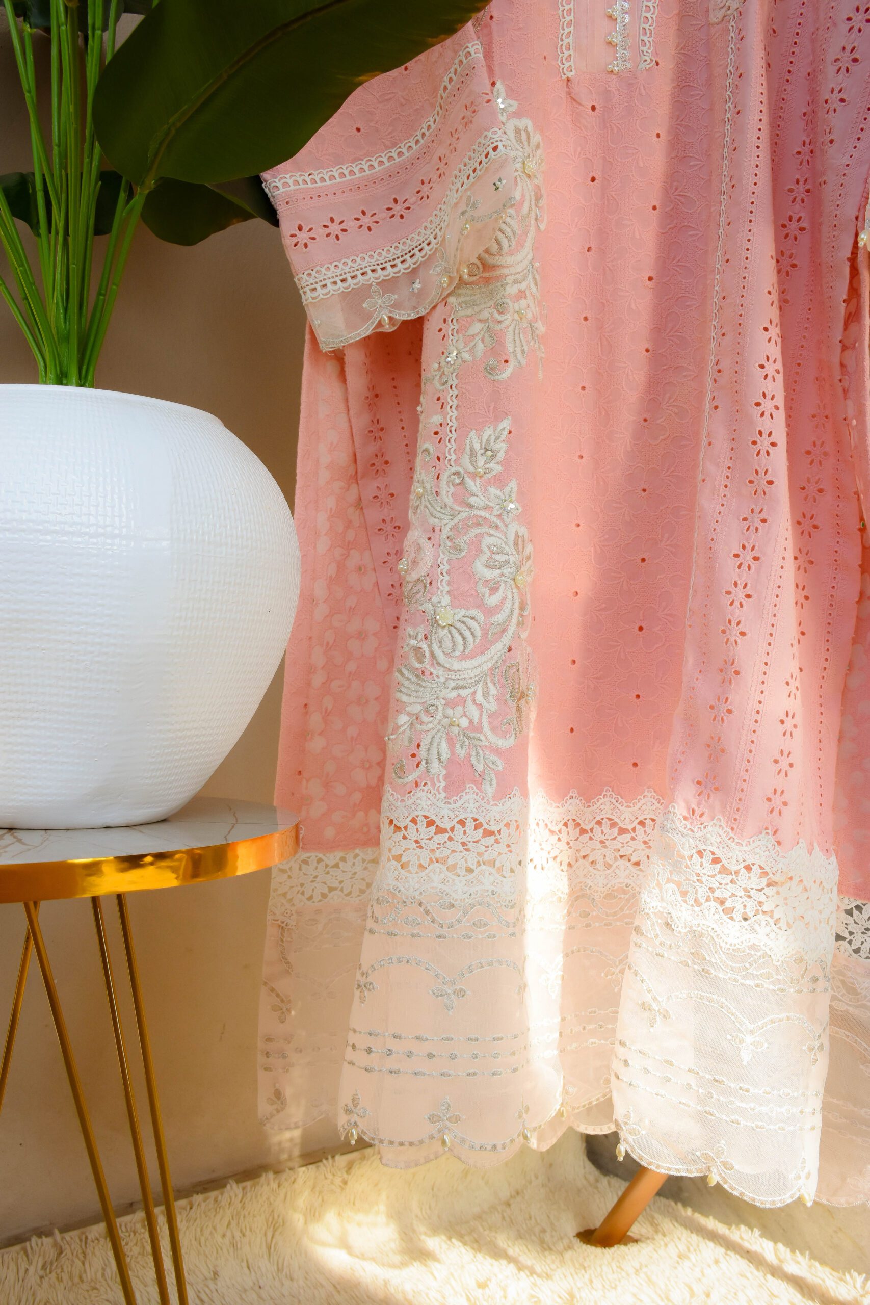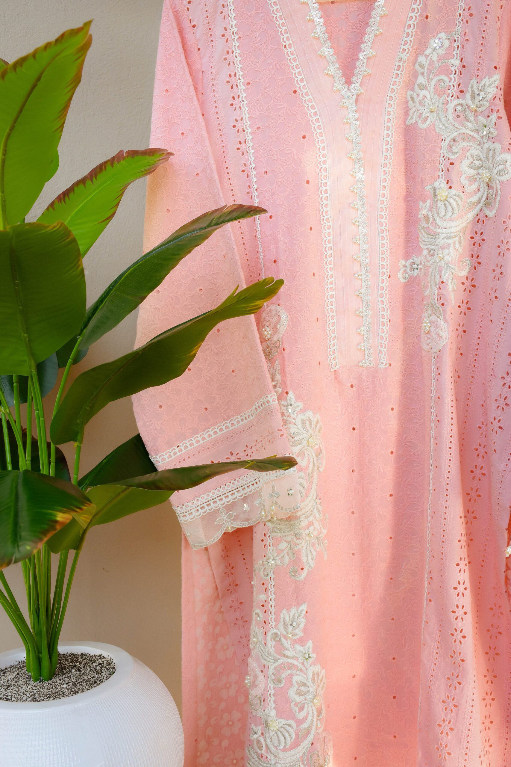 ‘Kali’ features a hand dyed schiffli embroidered base with intricate floral patch work and pearl embellishments to make the ensemble stand out. Paid with color coordinated chiffon dupatta.Â