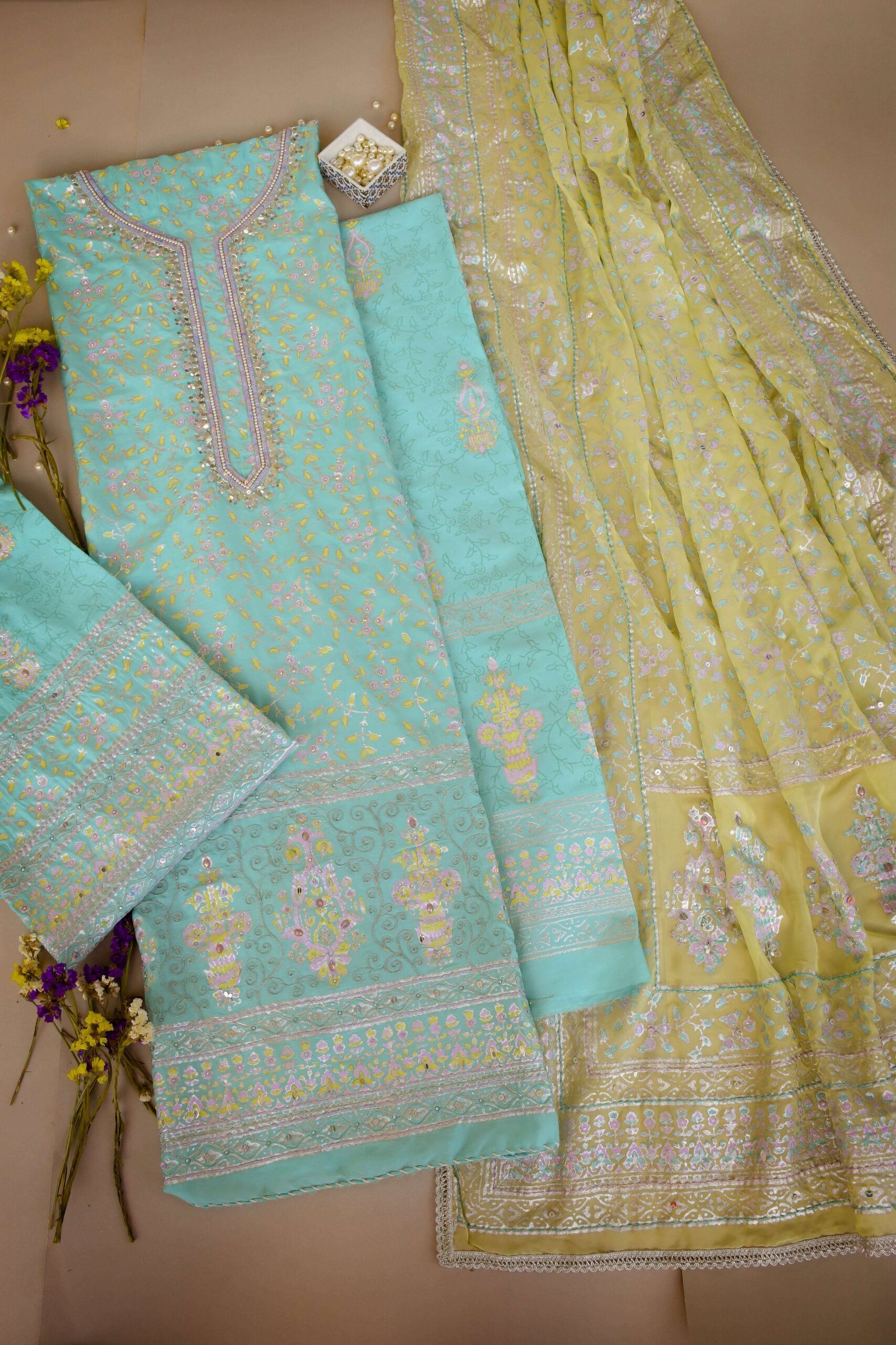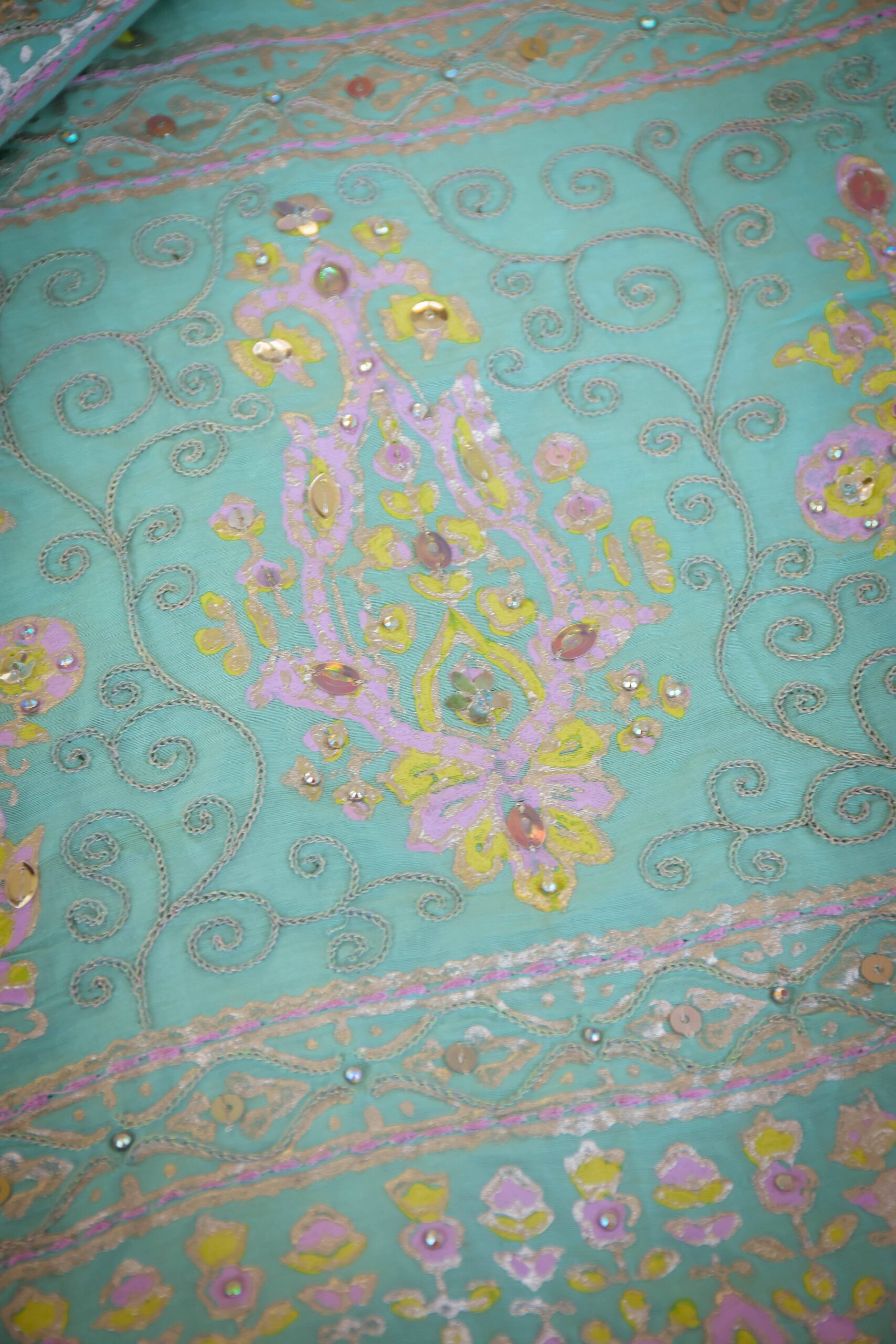 Drenched in ethereal hues of turquoise and apple green, this hand dyed and heavily hand block printed pure silk shirt is an epitome of grace and sophistication. From a neckline created with pearls and sitara to beautiful aari motifs on the shirt’s border, every detail in this piece is breathtaking. To elevate the look, multi-coloured beads have been carefully placed all over. Paired with a heavily hand block printed dupatta on an apple green canvas embraced by multi-colored beads and sitara and fancy silver lace on all four sides.  Â
