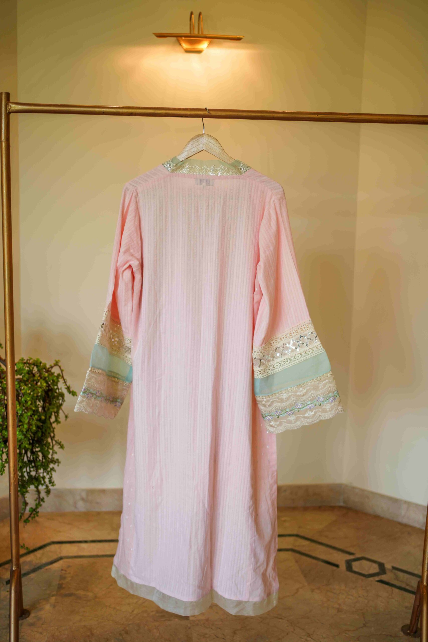 A graceful long paneled shirt adorned with shimmer laces in cream, floral organza border with