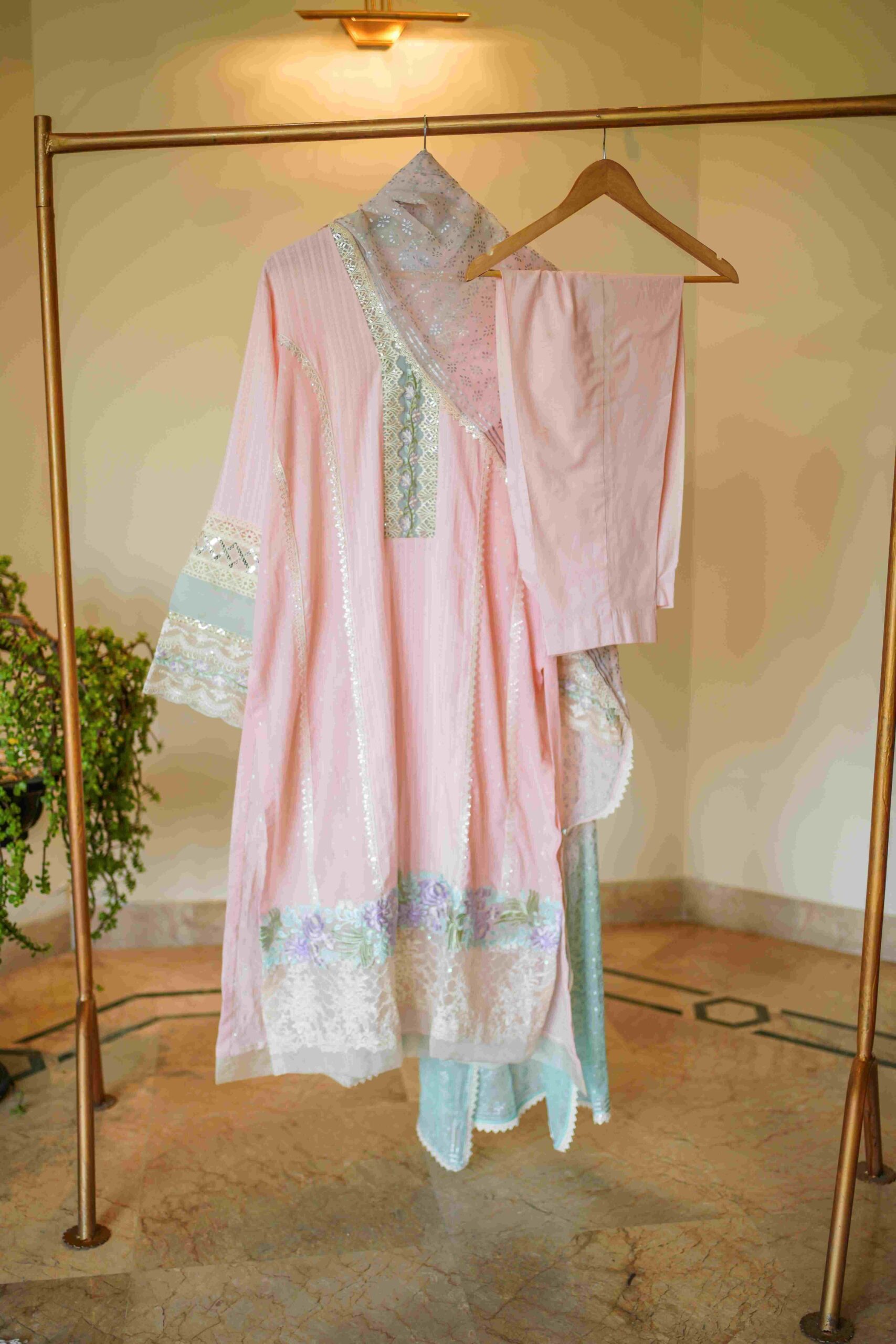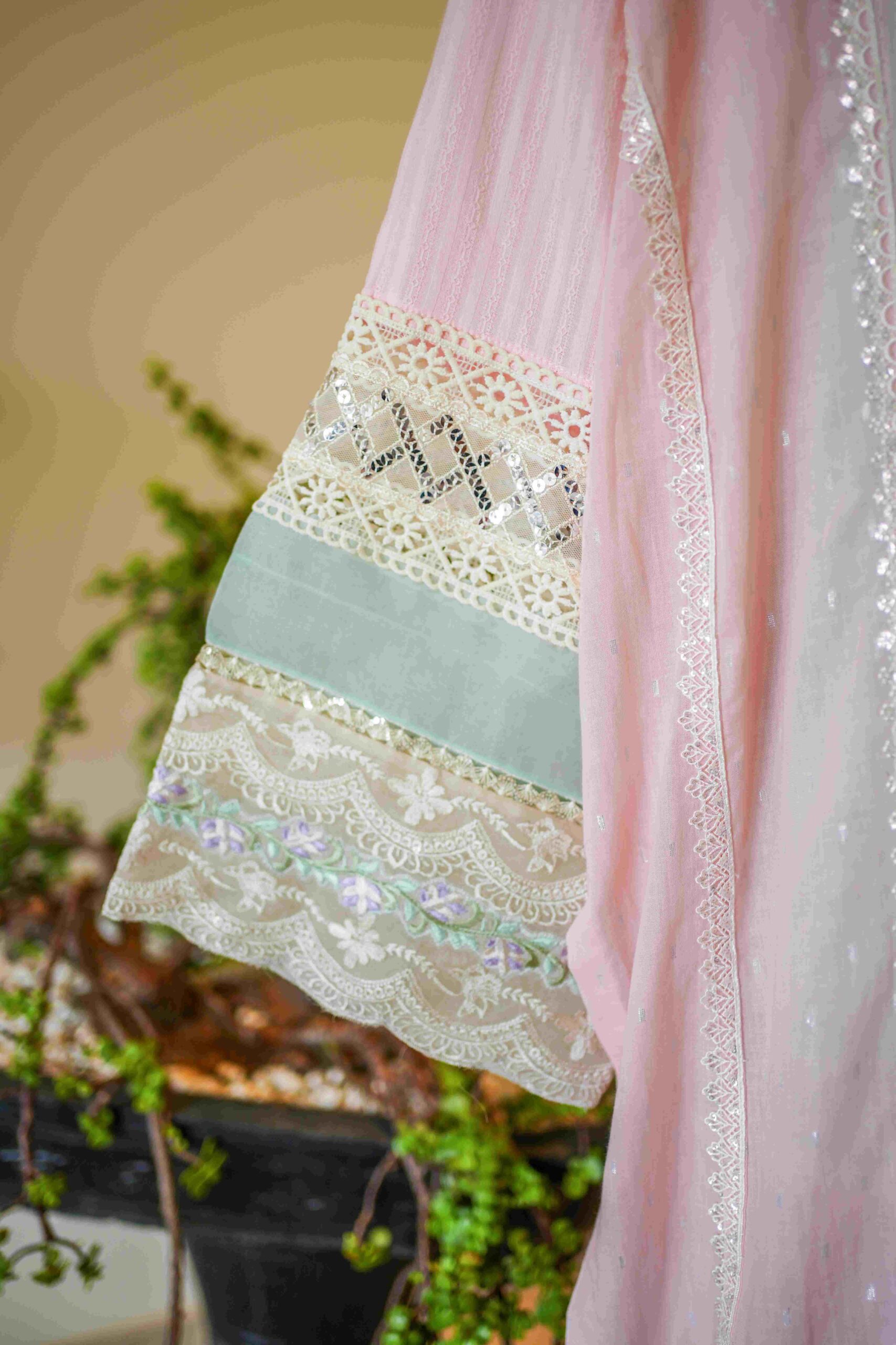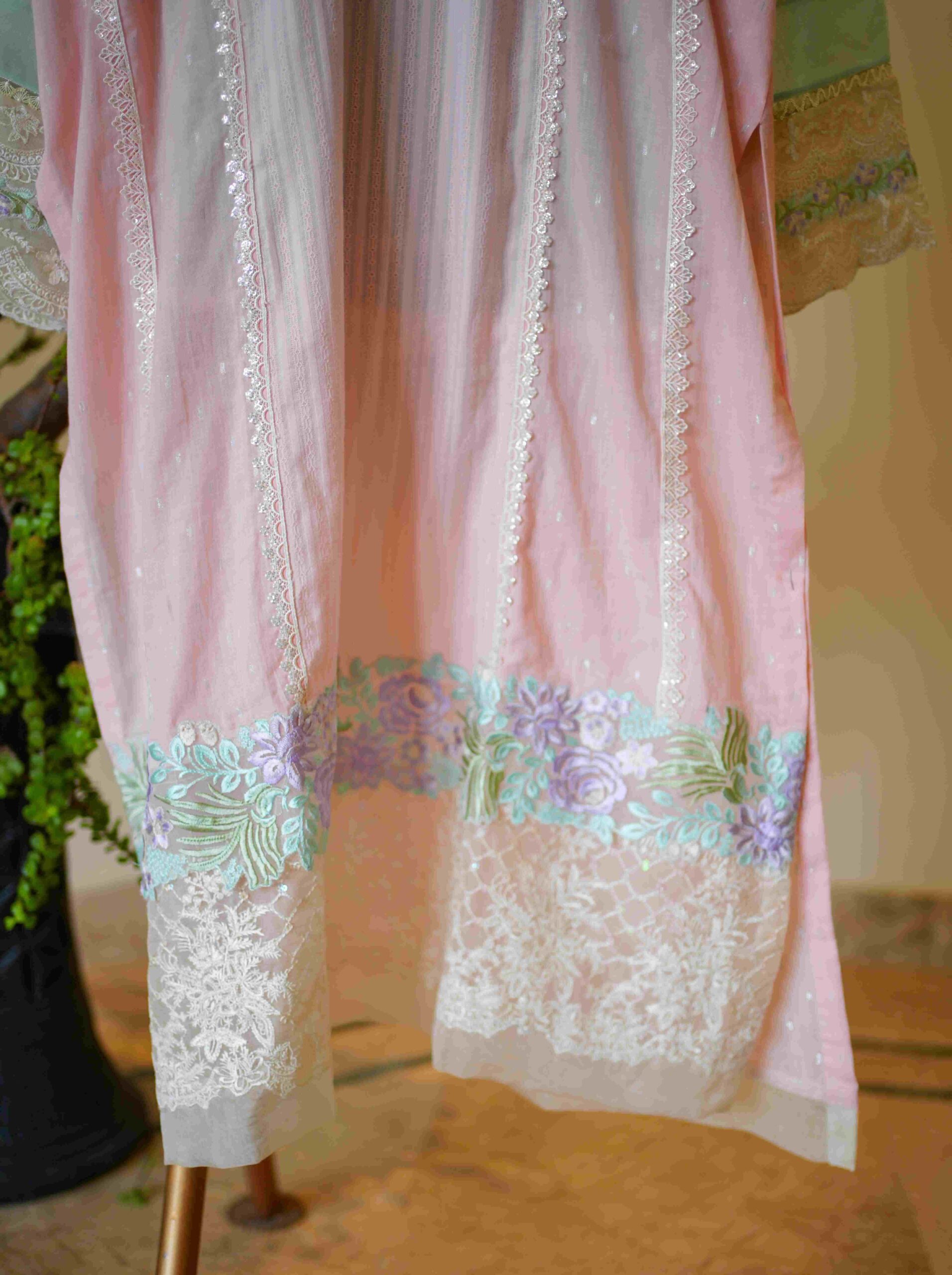 hints of light blur, soft purple and blush pink. A border embellished with opulent sitara is also