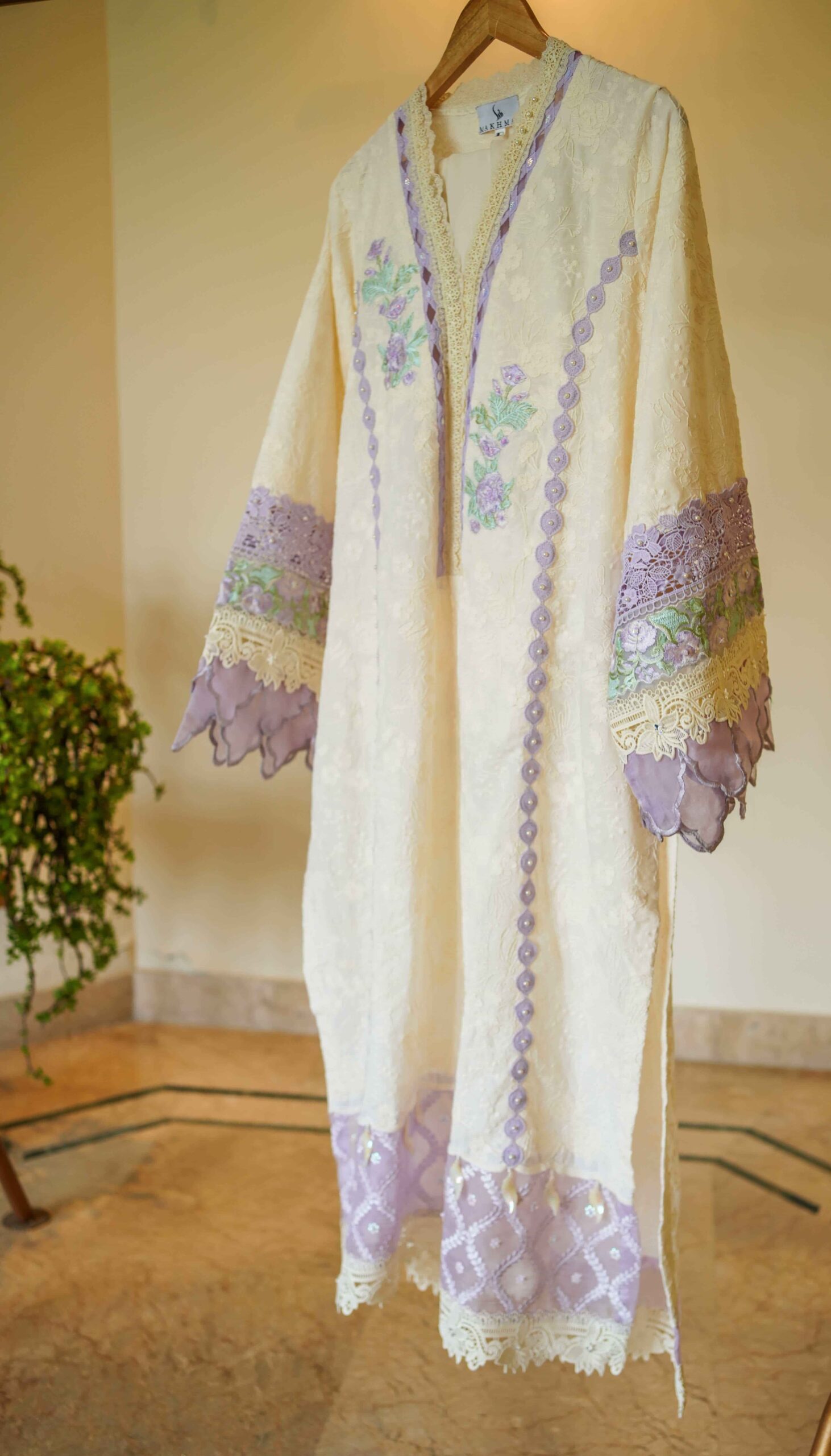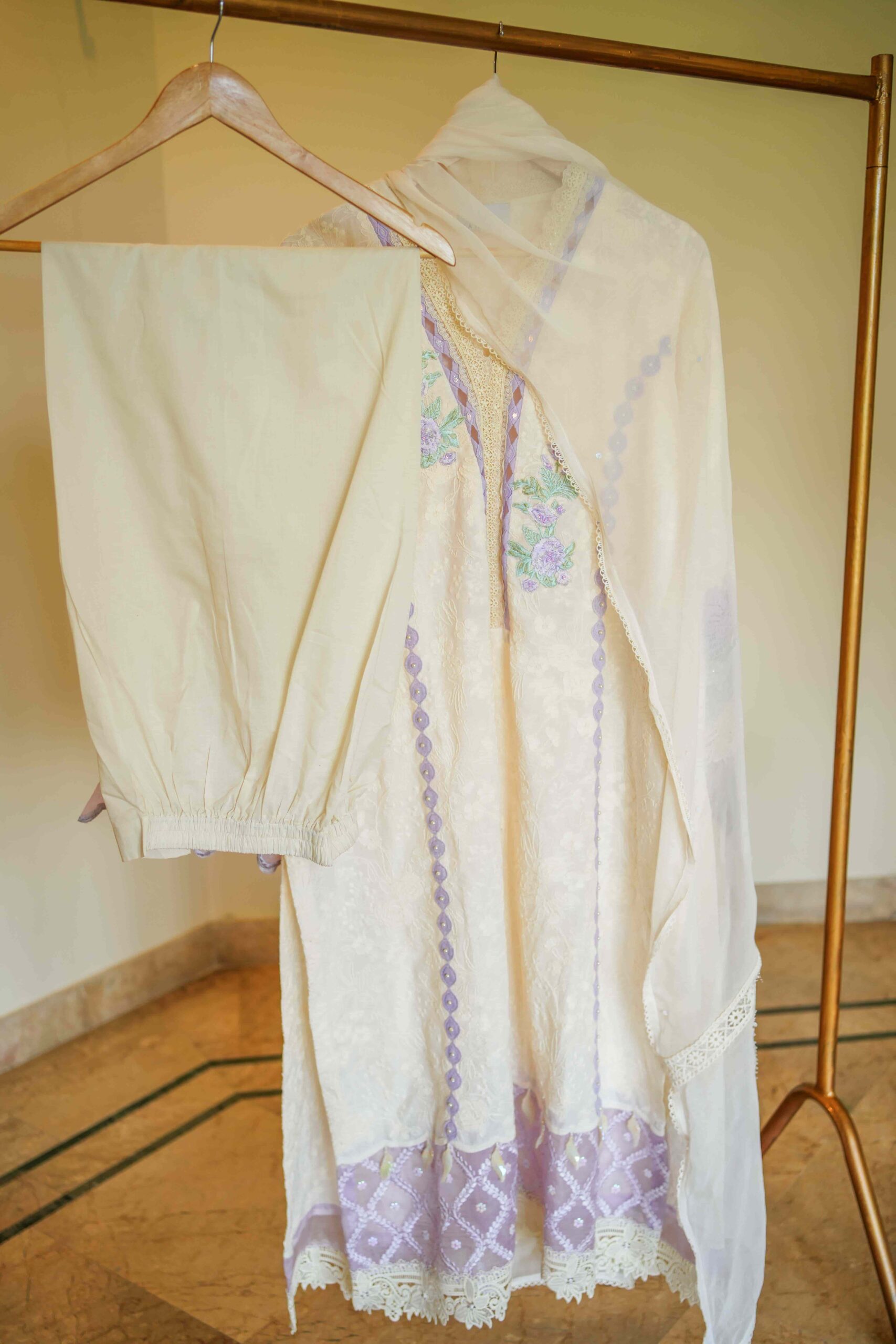 Nahal is a timeless summer ensemble, crafted in soothing hues of cream and lavender. The