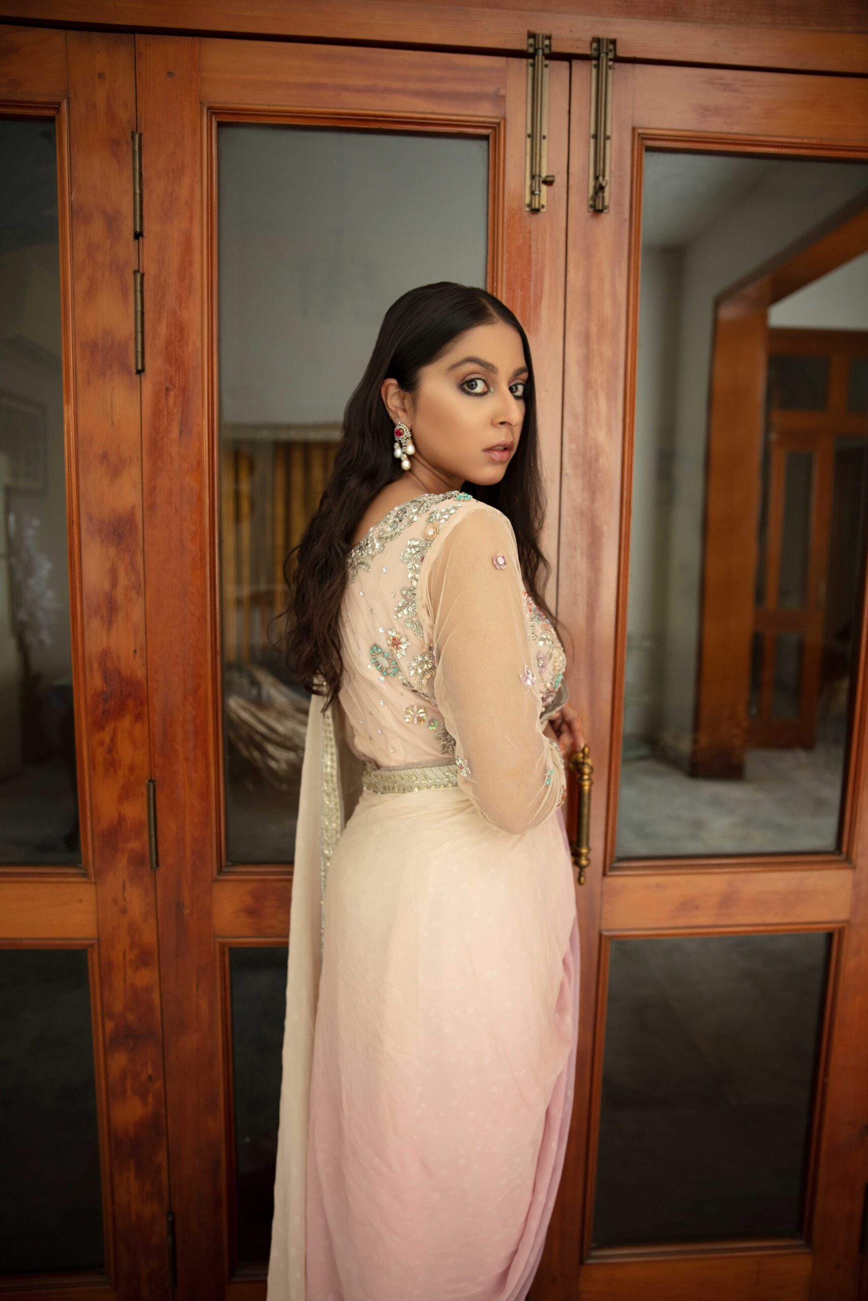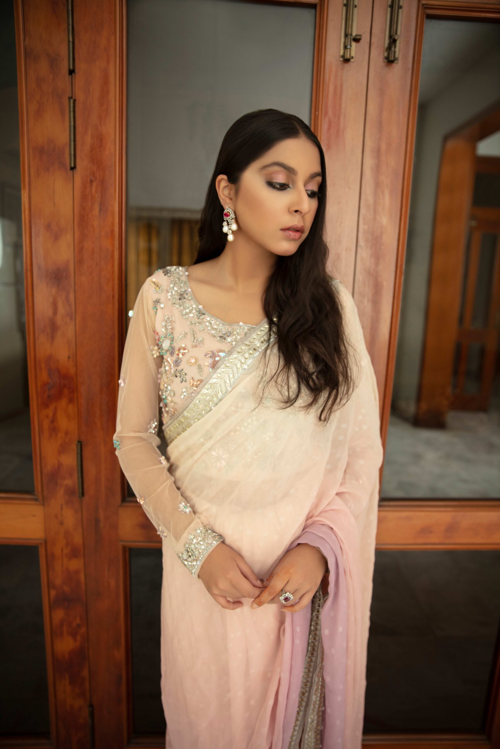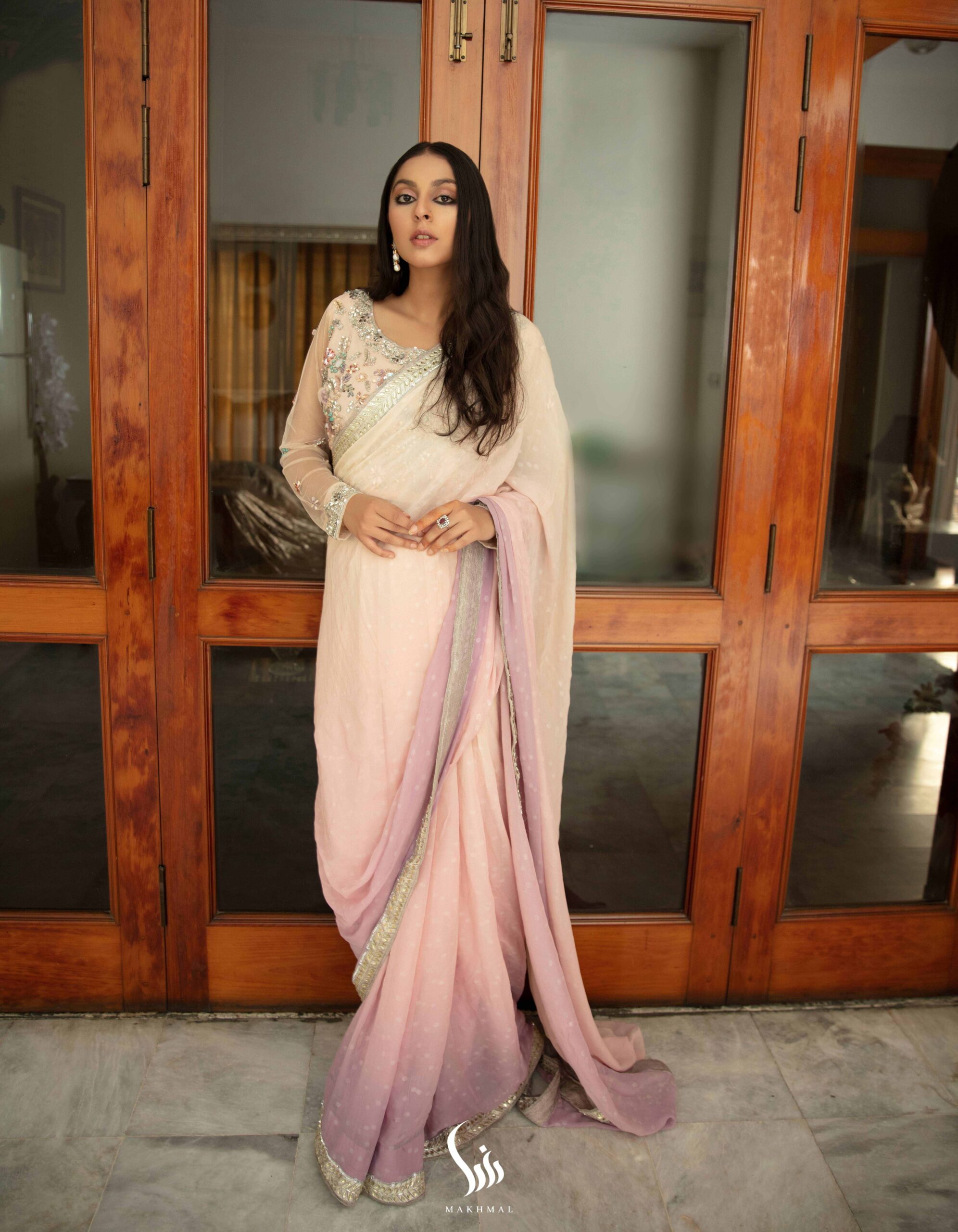 Laden in swarovski crystals and sequins, this gorgeous saree is a piece of art. To make it dreamy, soft shades of lilac and pink were used with impeccable finesse.