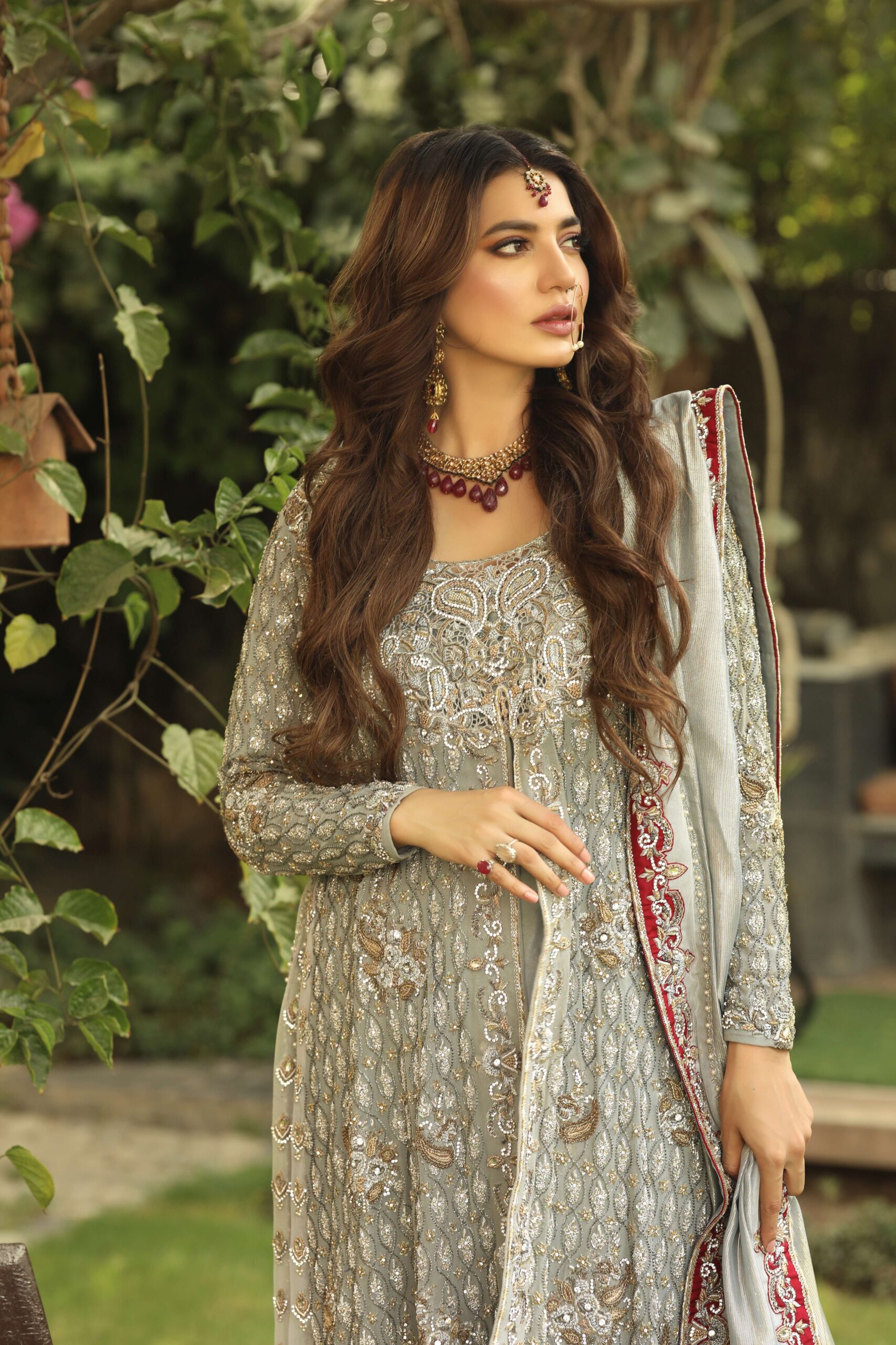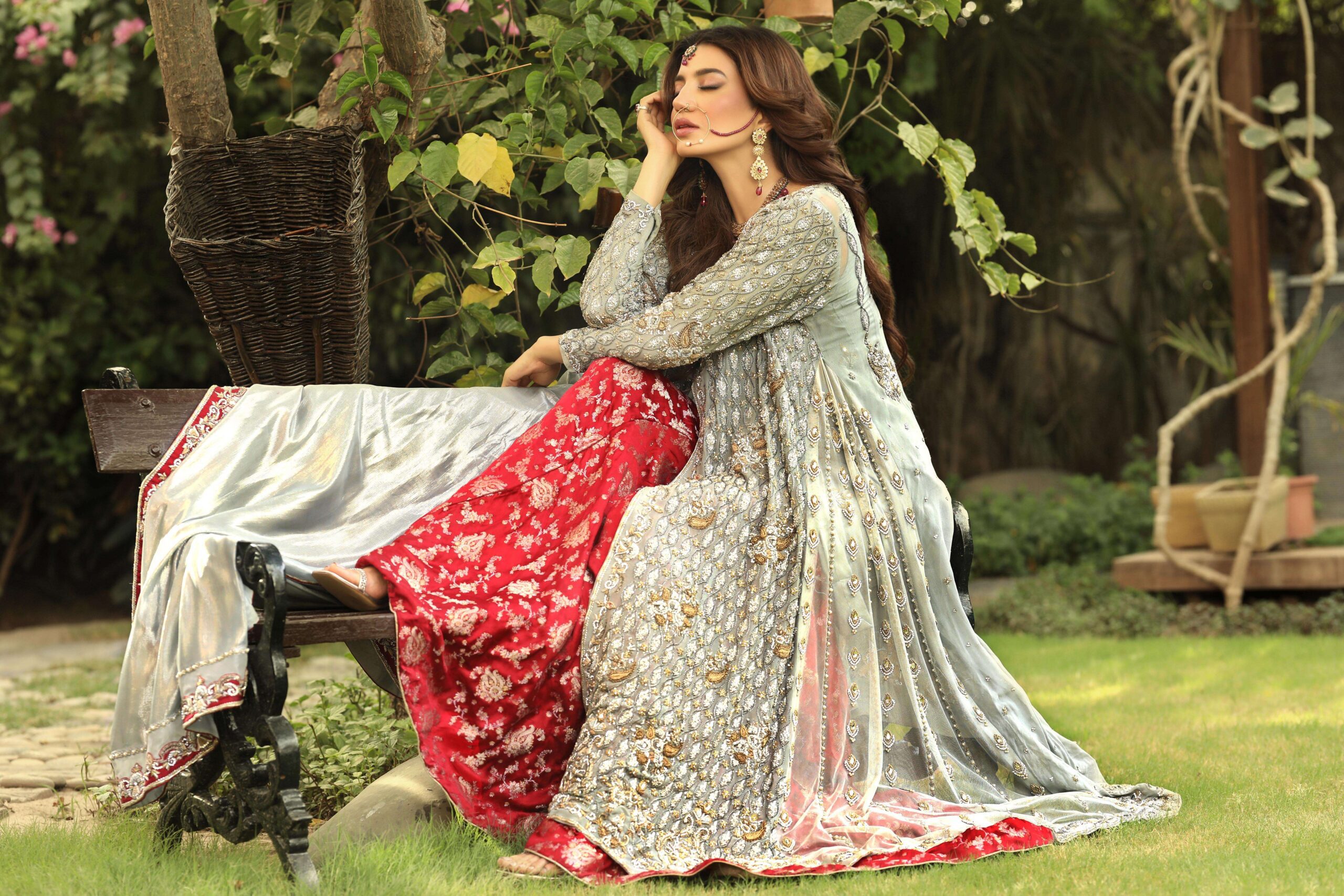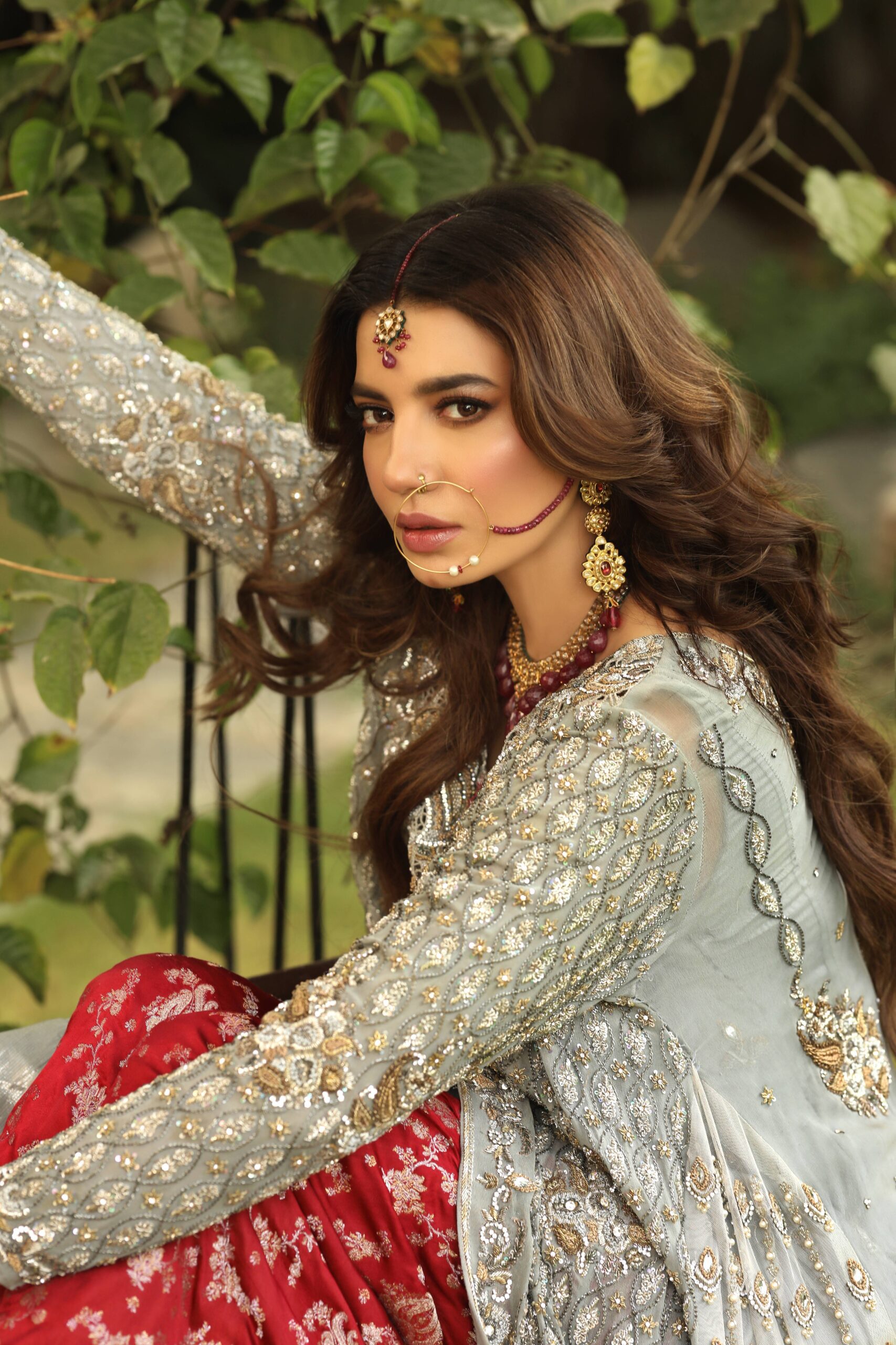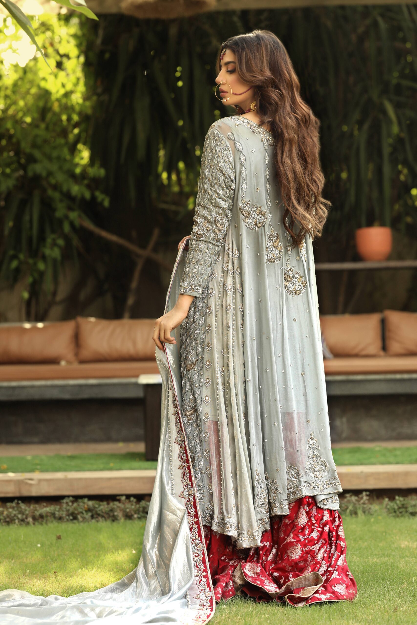 Noor from our bridal collection Mehrmah is a rare combination of Swarovski and zardozi work. This attire beautifully wraps a sense of classic elegance with its long front open heavily worked chiffon gown and intricately created short undershirt. Styled with a deep red coloured jamawar sharara and pure shimmer chiffon dupatta with a deep red colored applique border created with swarovski and zardozi work on all four sides.