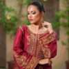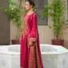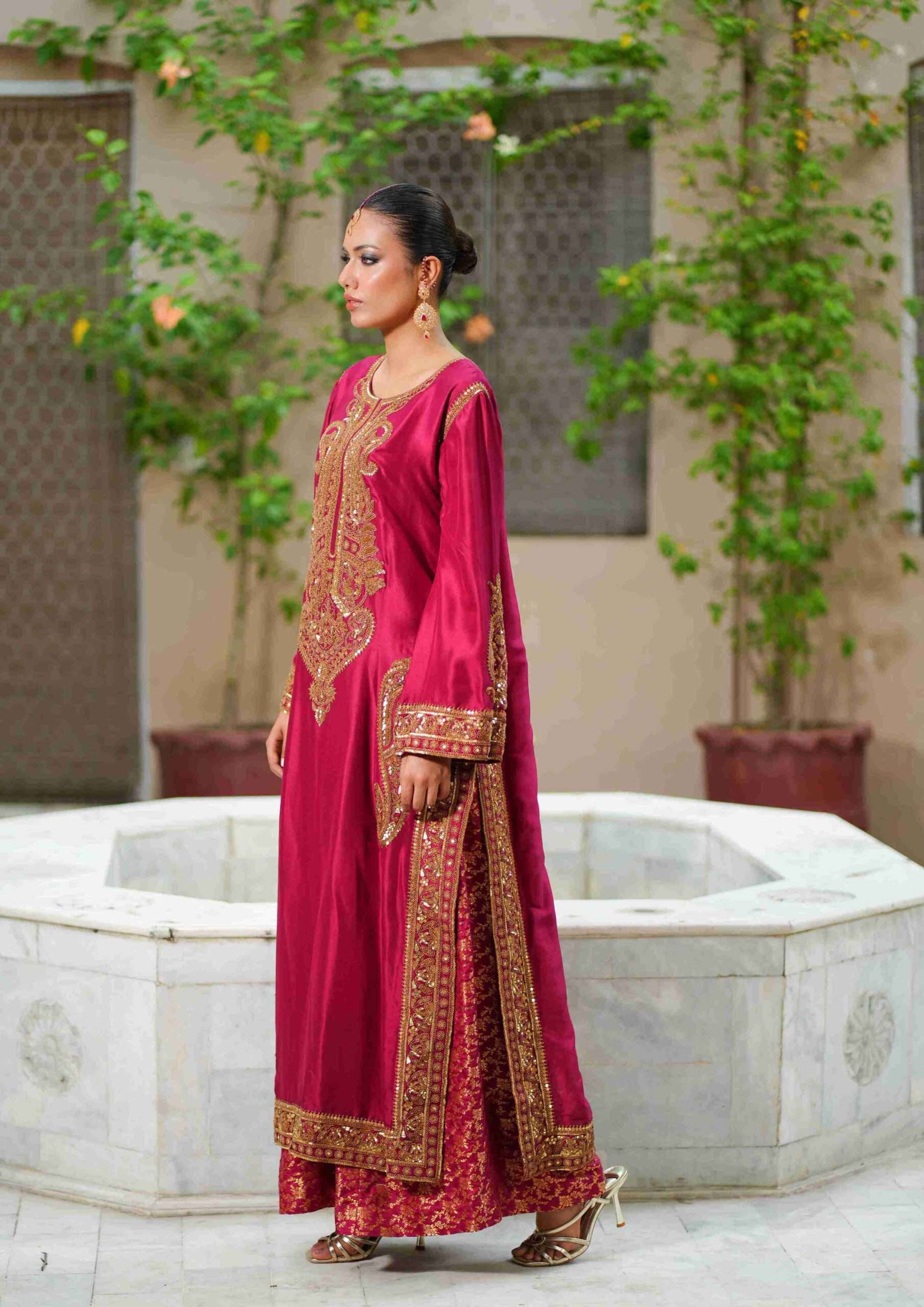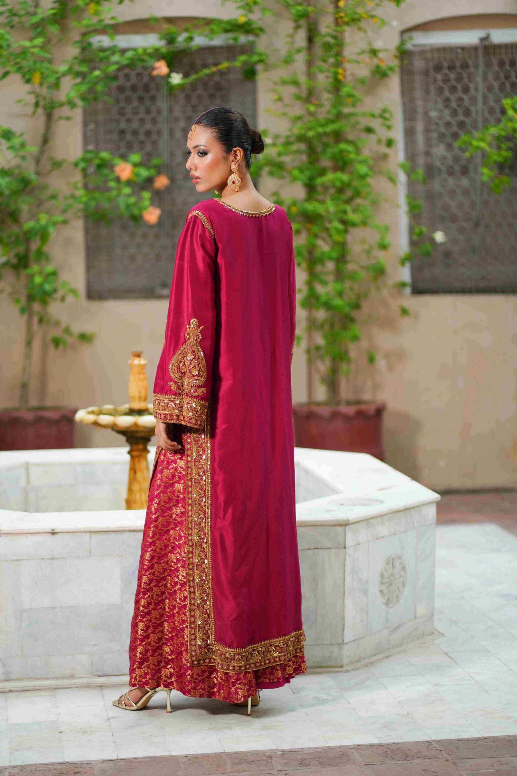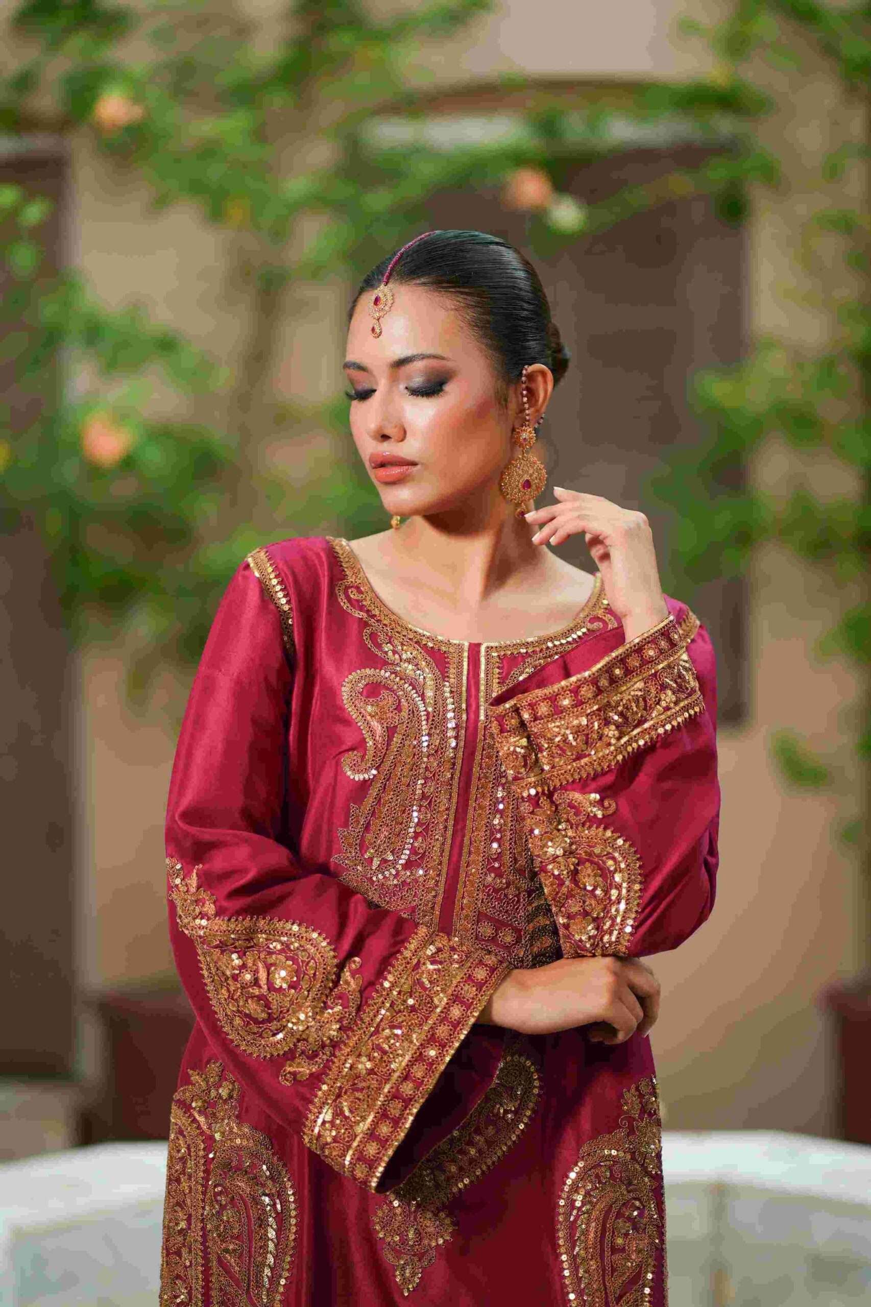 Wrapped in the warmth of a deep red dawn, Rubab is crafted on pure raw silk; a canvas that quietly reflects our regal heritage. The neckline and sleeves are adorned with intricate traditional marori work, each stitch carrying the finesse of classic Mughal craftsmanship. Delicate paisley motifs trail along the chaak, complemented by marori borders on the chaak and daman, both front and back. The look is completed with heavy jaal jamawar azaar pants, offering a refined touch of opulence.