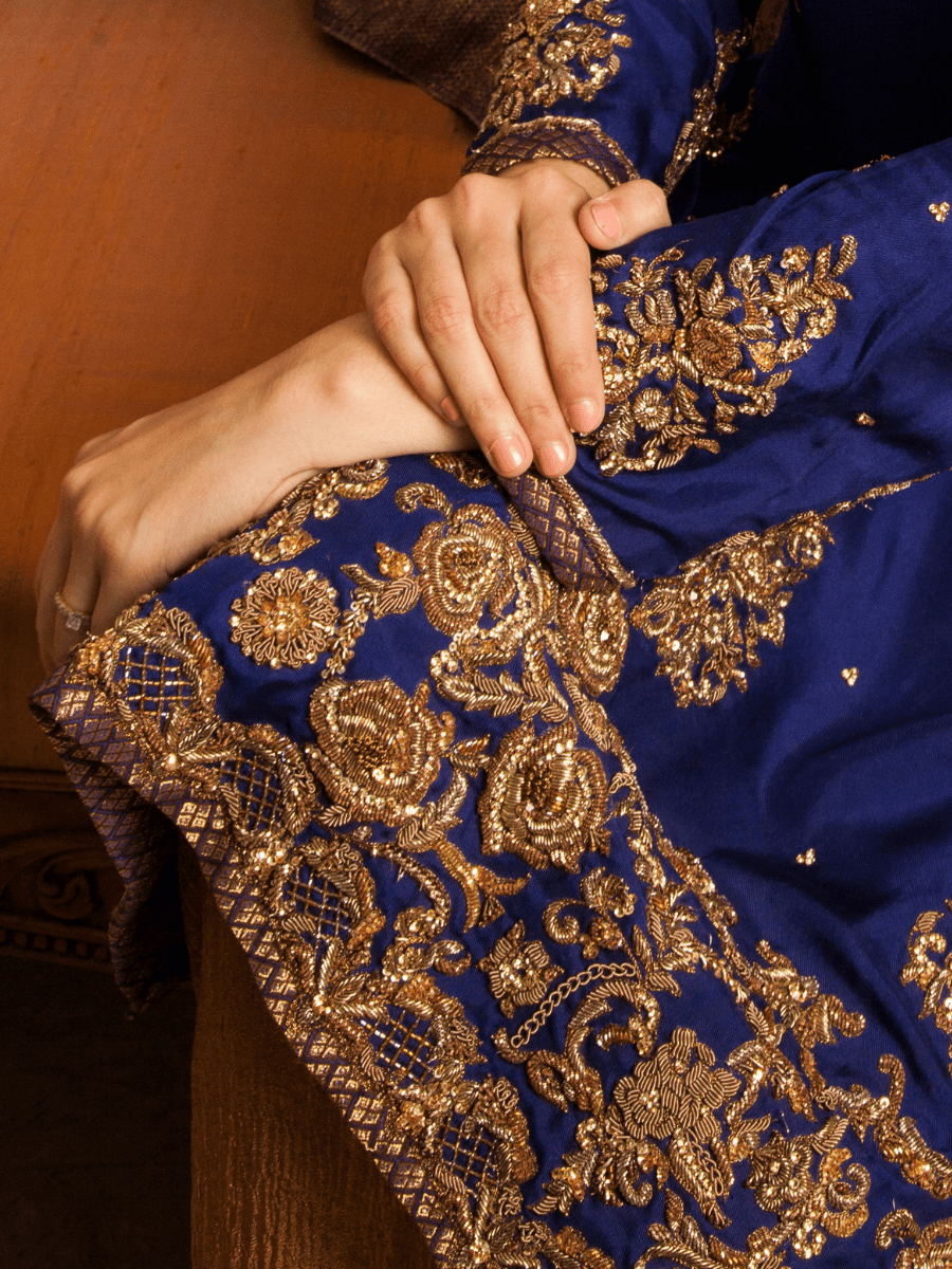 A royal blue silk shirt is meticulously adorned with heavy zardozi work. It is paired up with silk jamawar shawl with tassel fringes and crushed tissue sharara.