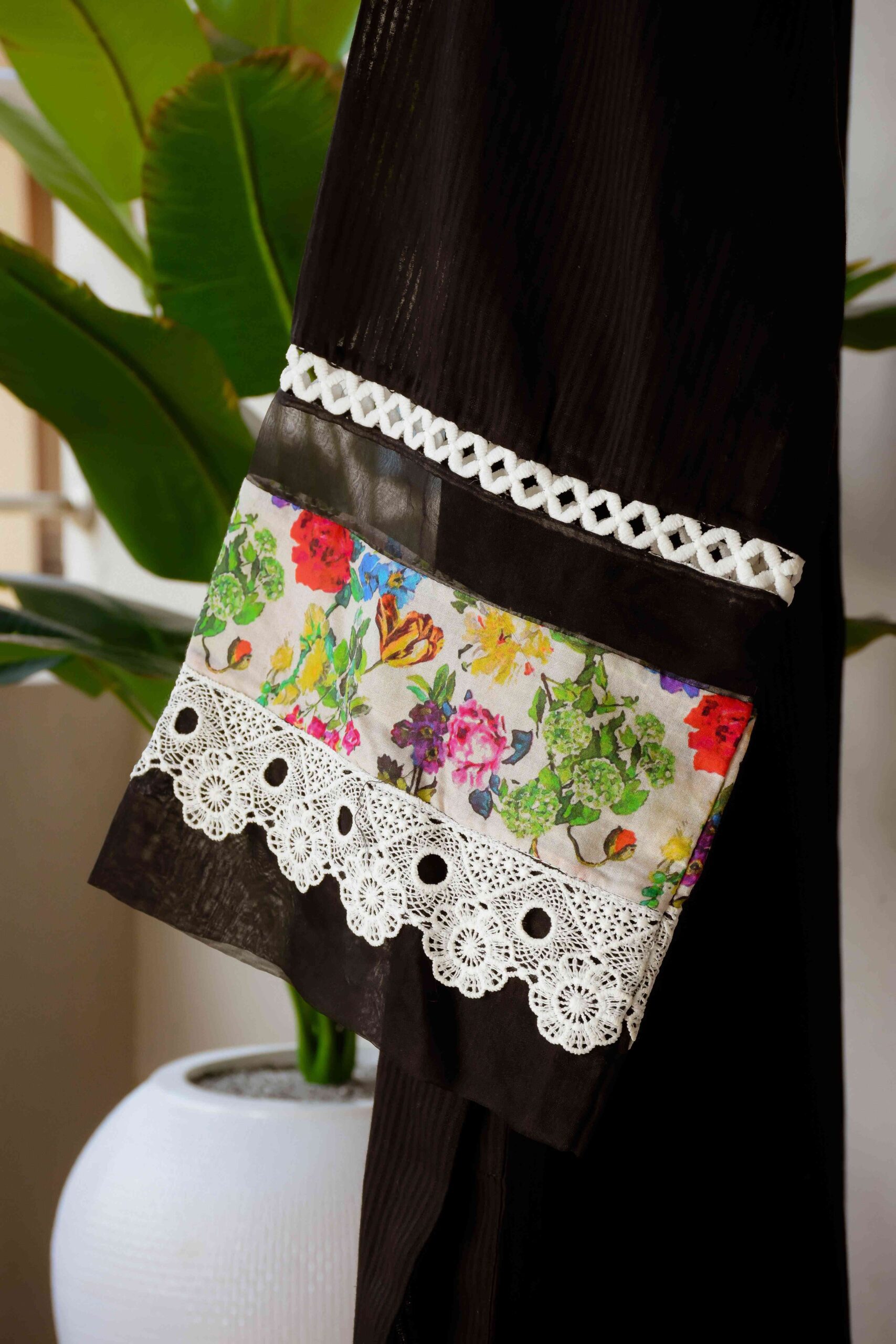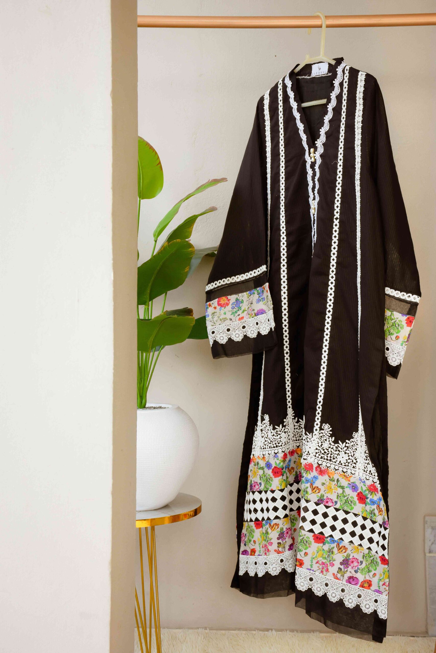 (It’s a single stitched piece available in black only. Dupatta and trousers can be provided upon request.)