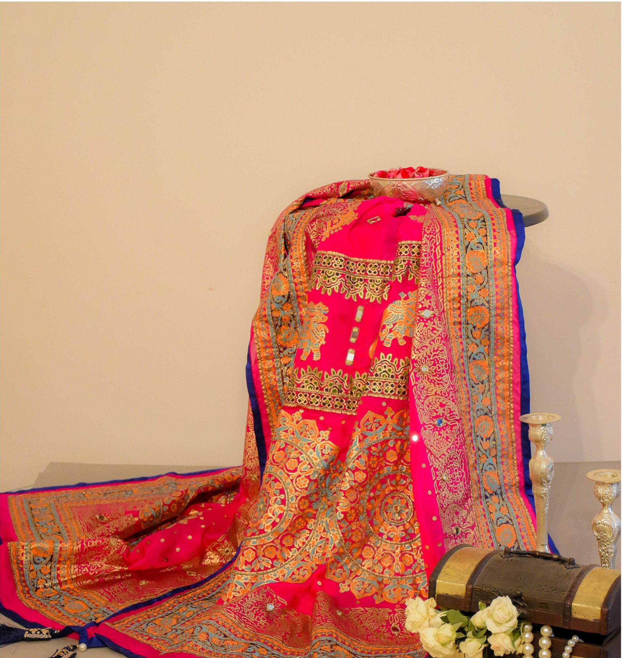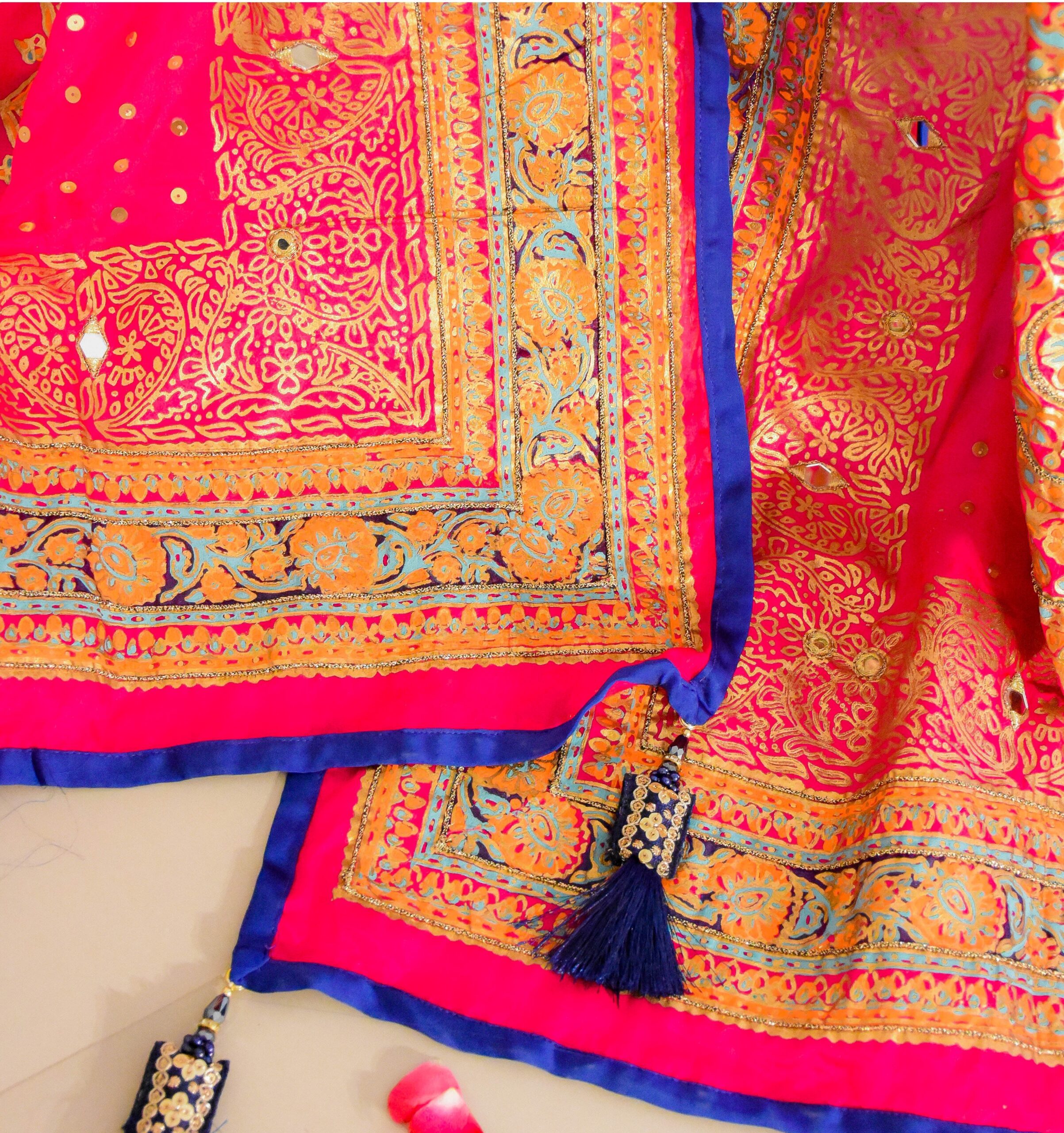 • Hand block printed and embellished 100% pure silk trimmed dupatta. Heavy mirror work all over.