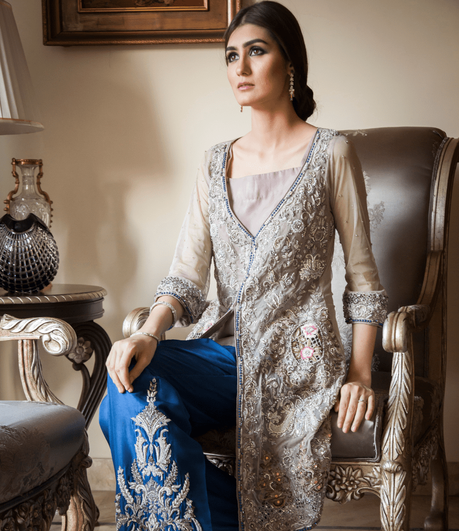 Create a glamorous look by wearing this front open net shirt with plunging neckline in zardozi work around thread motifs. Every intricate stitch tells a tale of skillful workmanship. Paired with heavily hand worked trousers.