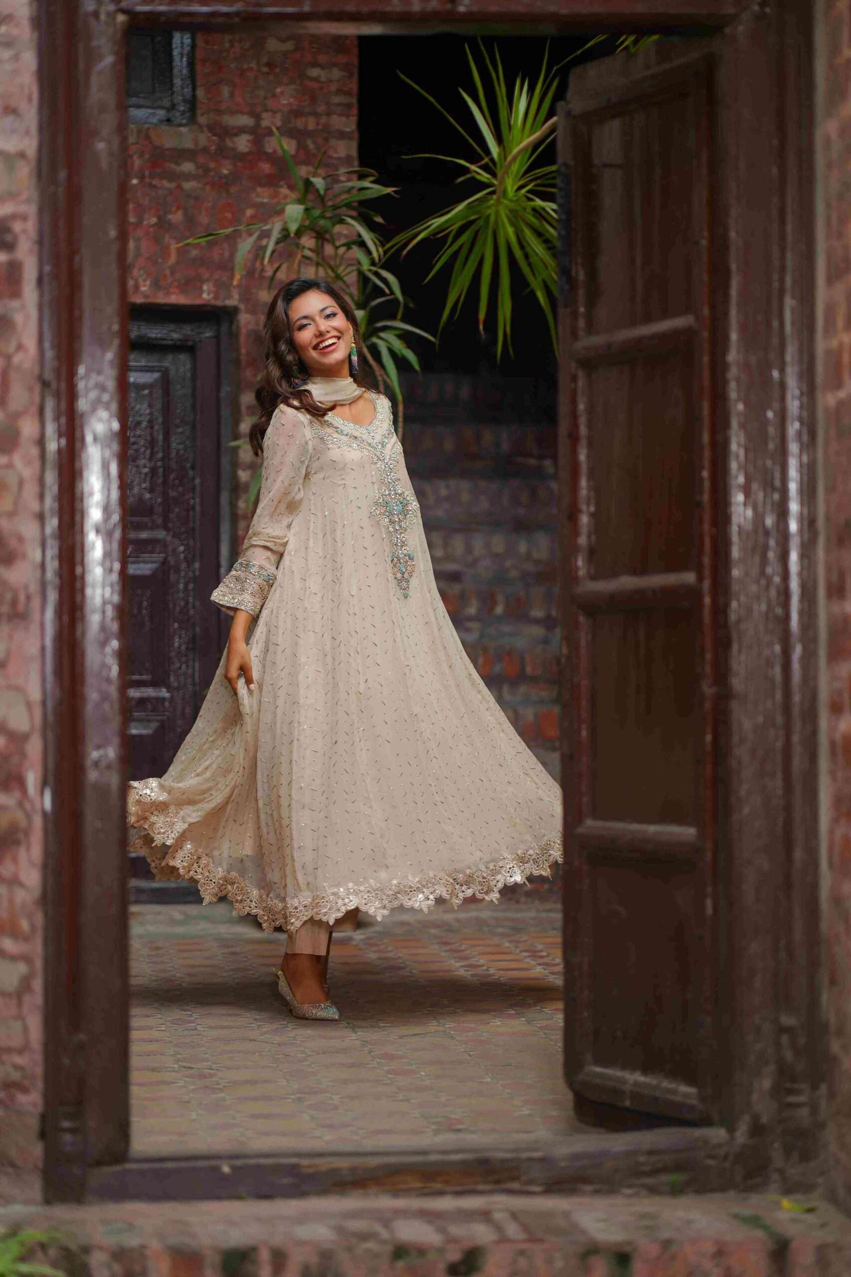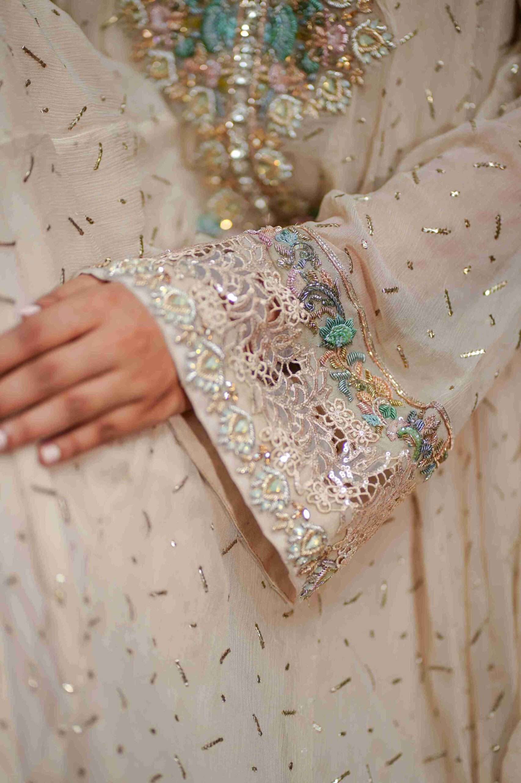 An exquisitely designed mukaish pishwas highlighted with intricate coloured zardozi work along the neckline and sleeves. Shimmer lace accents on sleeves and daman enhance its timeless charm.