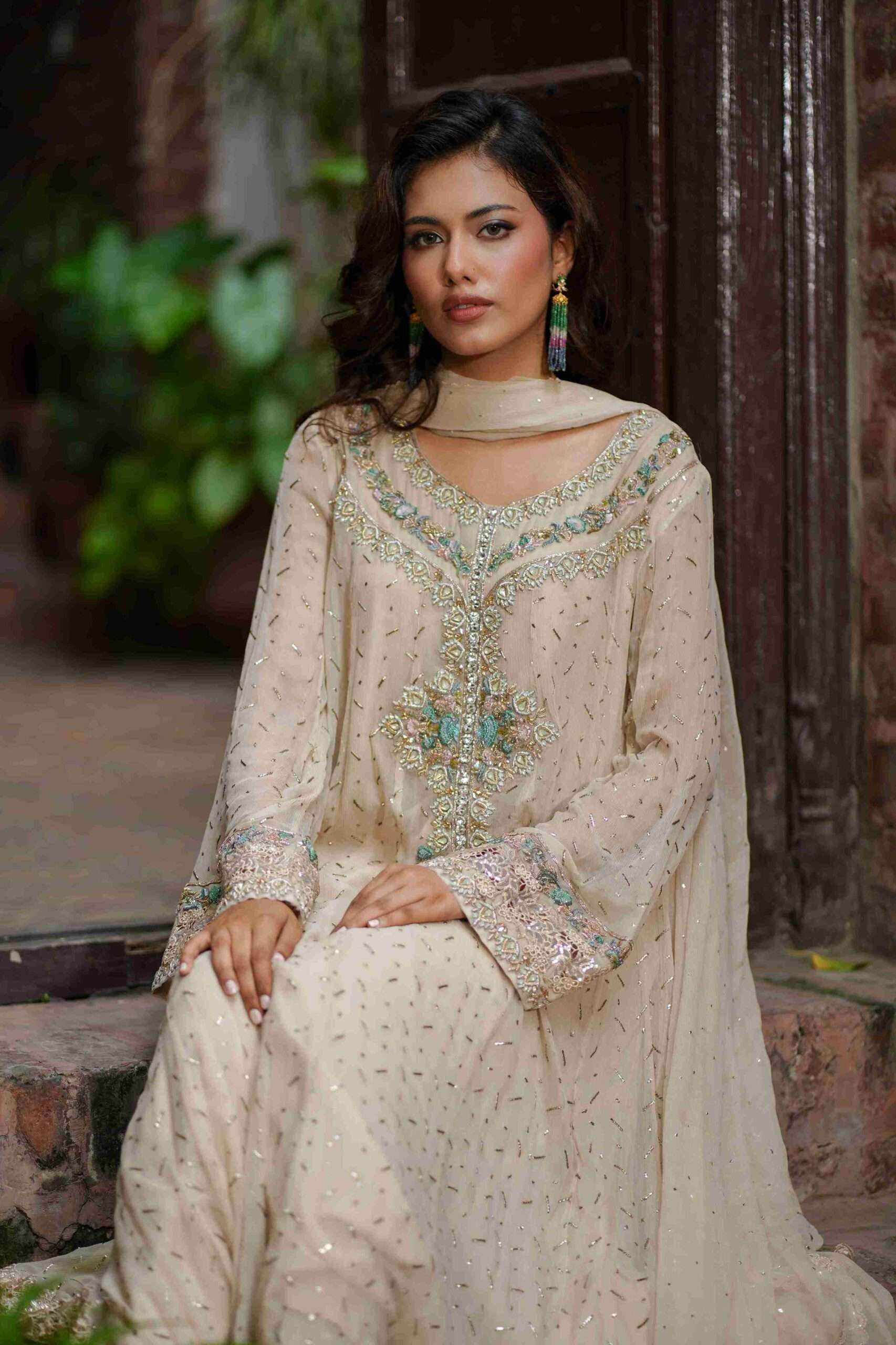 The ensemble is completed with a mukaish chiffon dupatta and perfectly matched trousers.