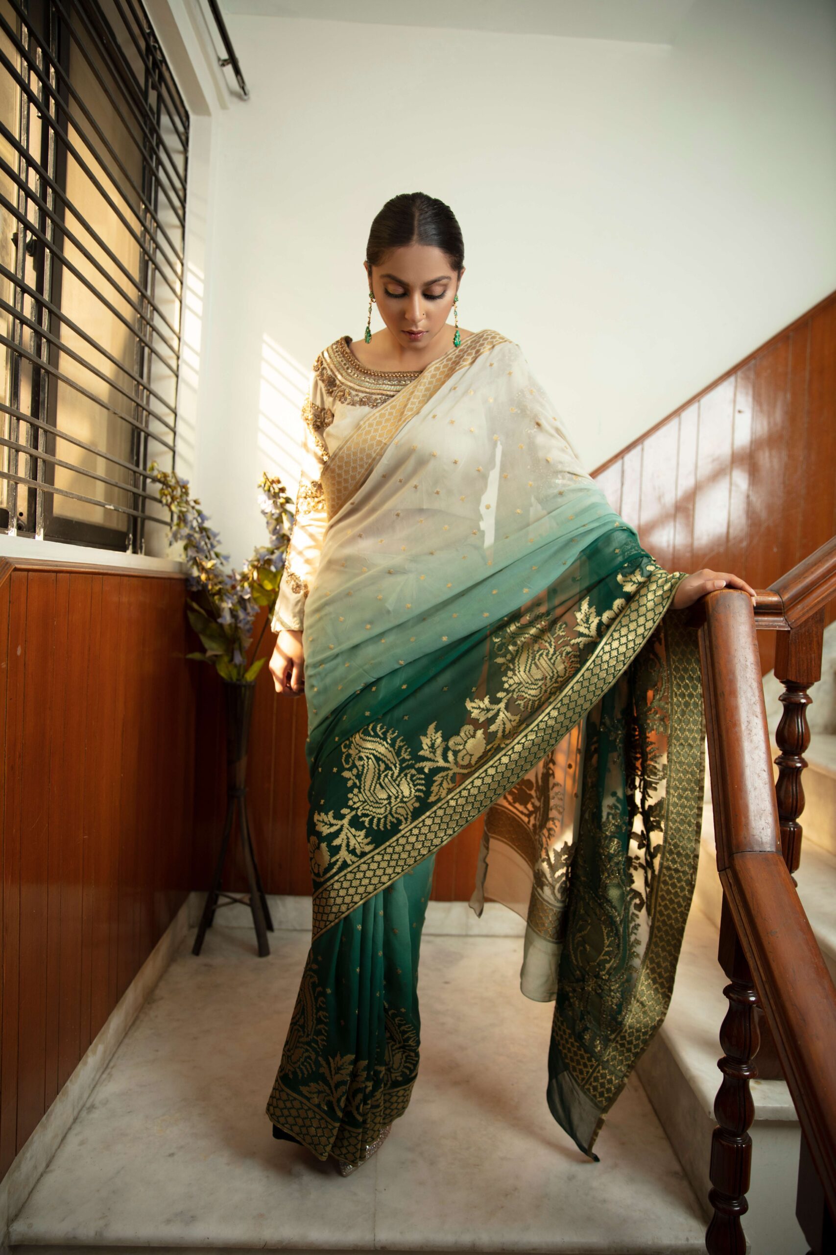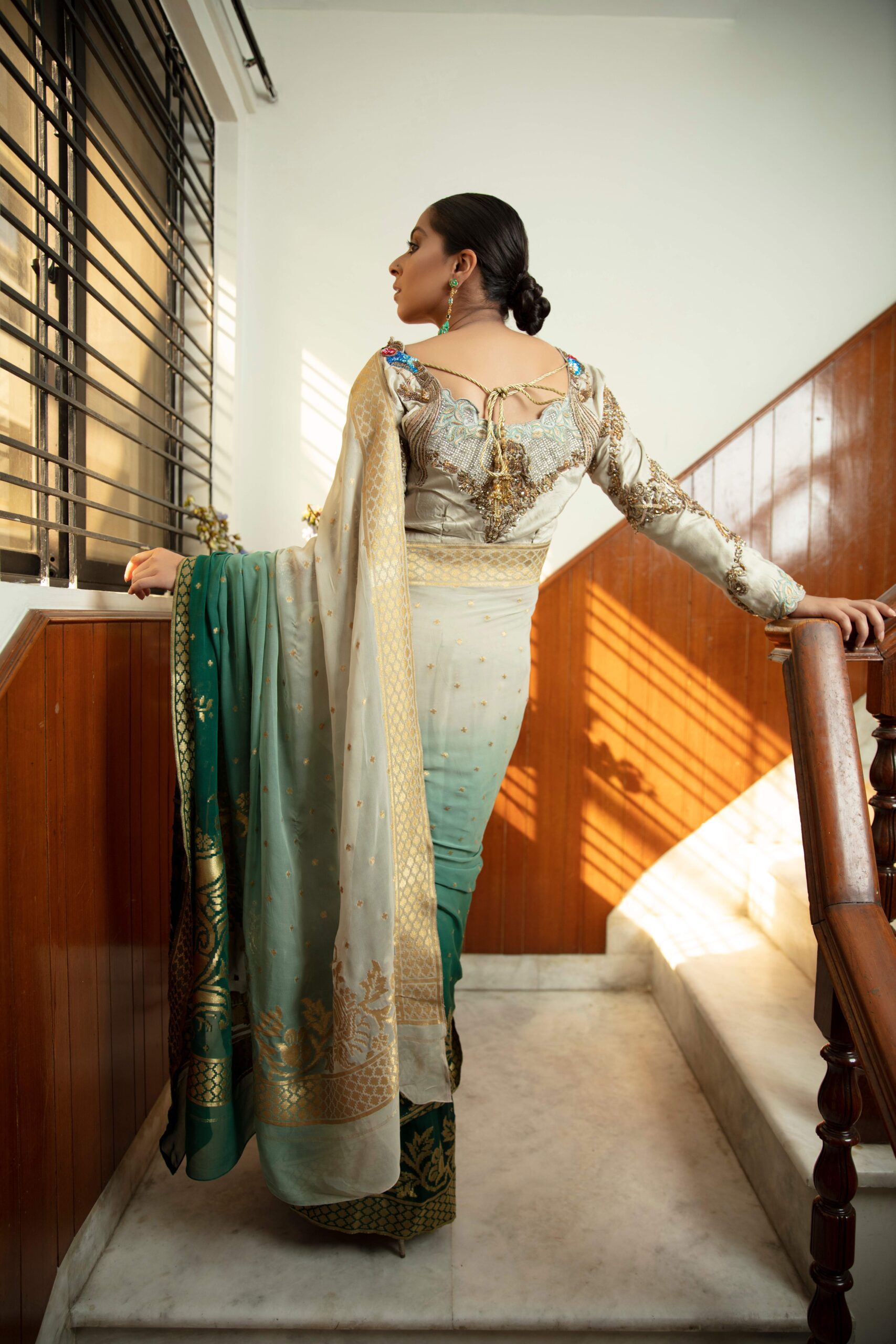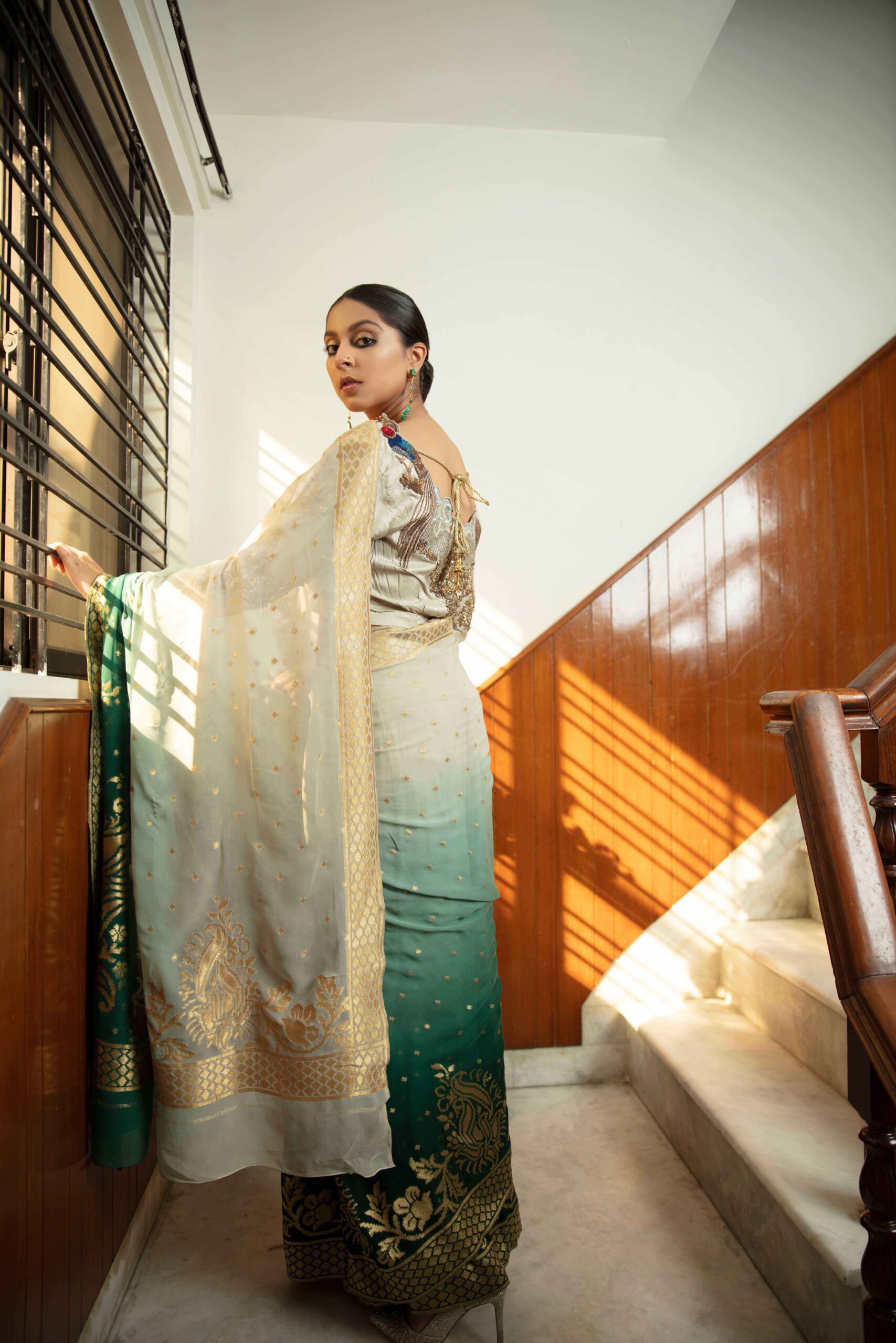 Shaded hand dyed kundan zaari saree with facets created in thread sequins and colored crystals at the back of a luxurious silk canvas.